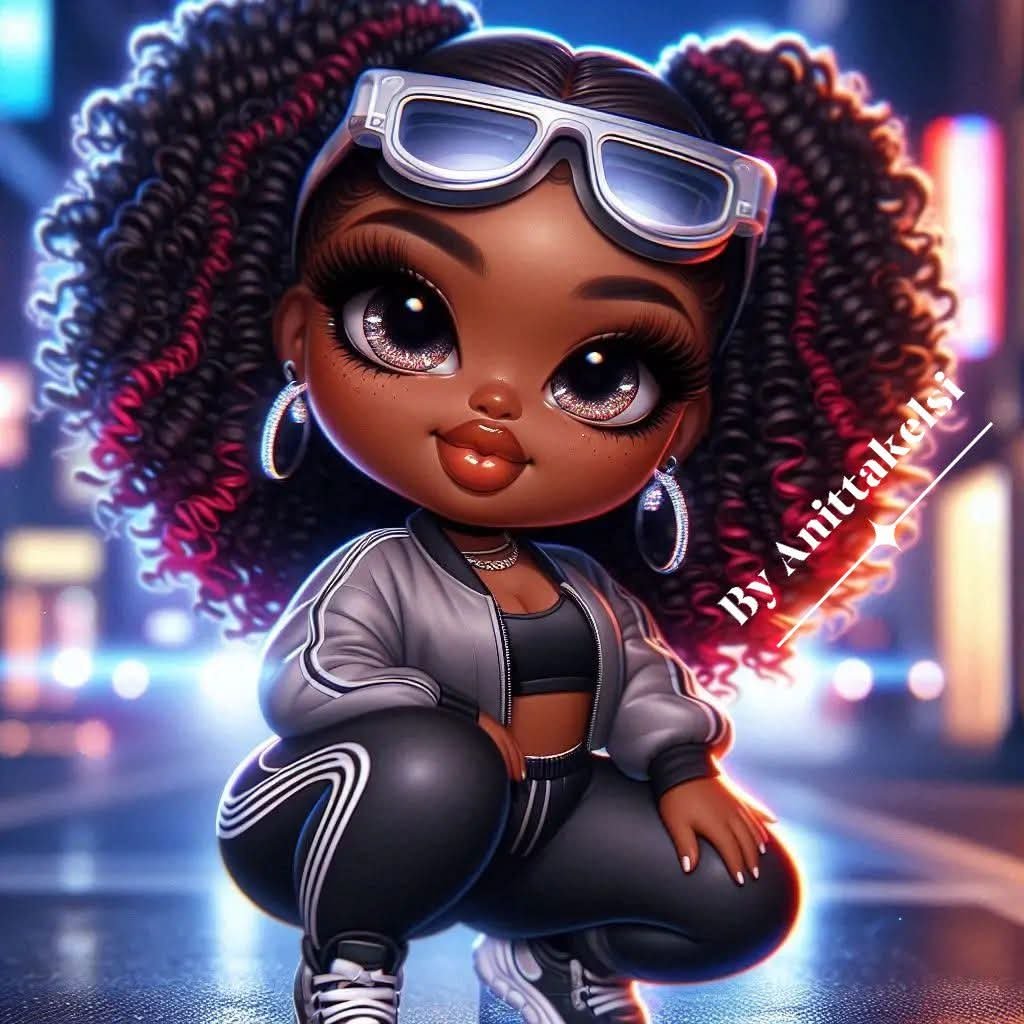 This chibi-meets-semi-realistic character commands the night with unapologetic flair. Her voluminous curls, kissed with red highlights, frame a face shielded by oversized futuristic shades. Squatting confidently on a rain-slicked urban street, she rocks a cropped black top, silver chain, and striped leggings—every detail dripping with street-style attitude. The blurred city lights behind her echo the drama and energy she exudes. She’s not just part of the scene—she is the vibe.