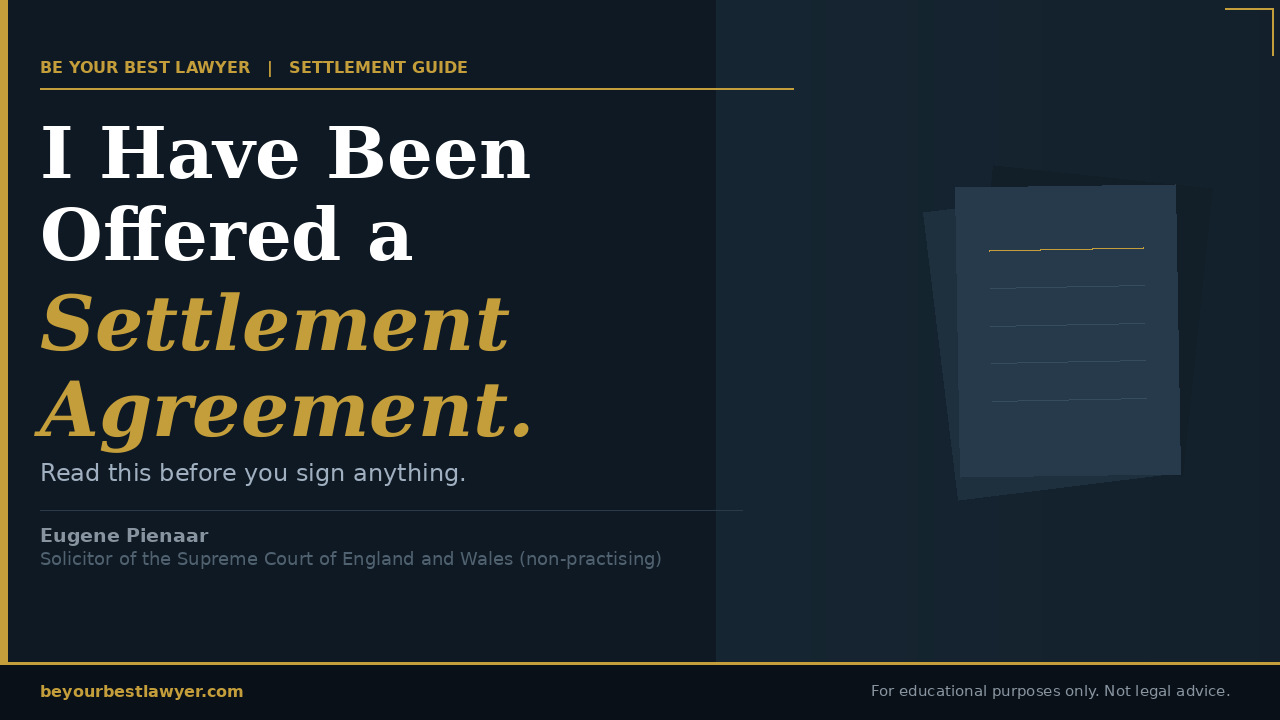 A settlement agreement is a permanent and irrevocable waiver of your right to bring employment tribunal claims. Once signed correctly, it cannot be undone. This pack covers the five legal requirements for validity, the ten questions to ask before you sign, what independent legal advice should actually cover, the tax treatment of payments, how to read restrictive covenants, and whether the financial offer is adequate given what you are giving up.
