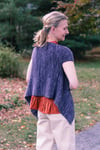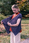 Rhadamanthys was the wise mythological Greek king who judged the dead and ruled the Fortunate Isles, where those heroes who had thrice been received into the Elysian Fields resided. Celebrate three blessings with this easy, sideways-knit sweater; it is knit in one piece with no seaming, requires no finishing, and is worked all in garter stitch. Three turning points in the short row shaping delineate body, yoke and collar, creating a shapely fit around the shoulders and upper torso. The garter stitch and extended front panels make it suitable for many shapes and sizes, and the fit may easily be further customized in length or circumference.