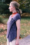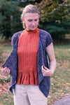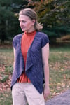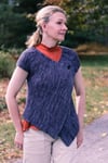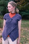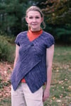 Construction: Rhadamanthys is cast on at the left front edge, and worked sideways around the body to the right front. Except for the full-row front panels, it is knit entirely in short rows using the wrap & turn method; there is no need to pick up the wraps and knit them together with the wrapped stitch when you encounter them on the following row, as the wraps will disappear into the texture of the garter stitch fabric.