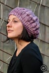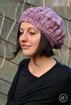 The gentle leaves that grow out of the brim adorn the body of the Hat, and graduate as stems of twisted knit stitches towards the crown. Drapey and slouchy, this beret is full of charm.