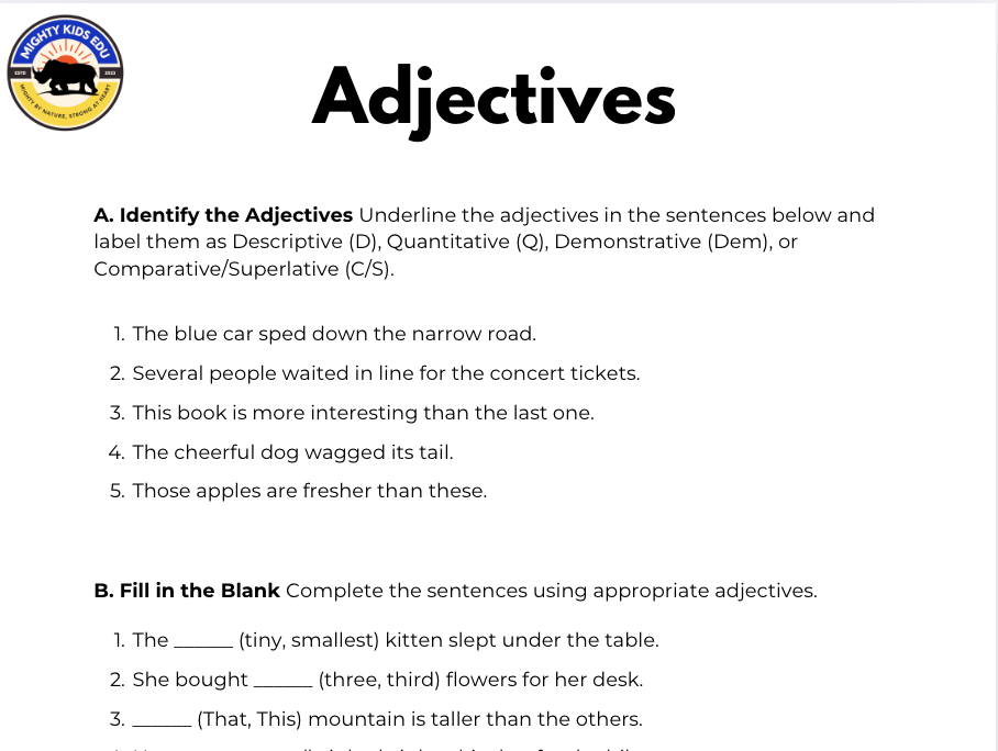This worksheet focuses on adjectives, teaching students how to identify, use, and classify descriptive, quantitative, demonstrative, and comparative/superlative adjectives.