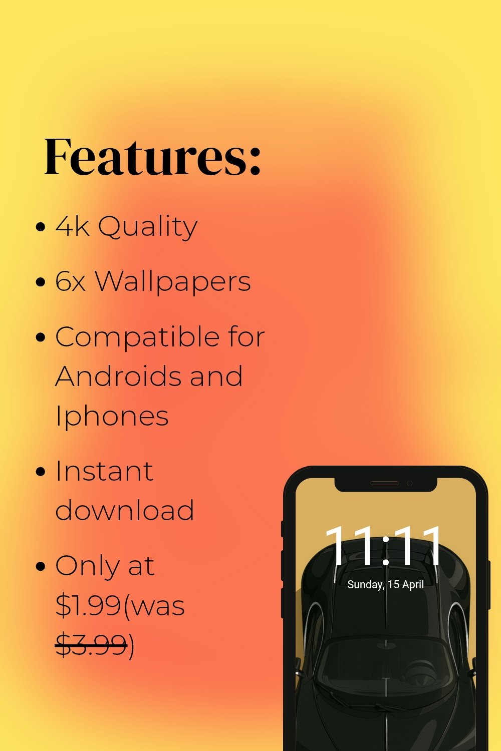 Upgrade your phone’s look with this exclusive set of 6 ultra-high resolution car wallpapers! Featuring stunning illustrations of iconic supercars, these wallpapers are optimized for both Android and iPhone devices. Enjoy instant download and premium 4K quality—all for just $1.99 (was $3.99).