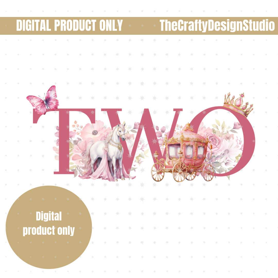 Make your little one’s birthday extra magical with this charming “TWO” digital design. Featuring an elegant pink theme adorned with floral accents, a graceful unicorn, and a regal carriage crowned with gold, this design is perfect for celebrating a 2nd birthday.