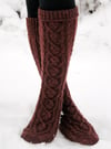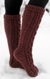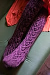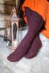 Liisi's socks were inspired by an old Finnish carol in which brother Juhani and sister Liisi are woken up early on a frosty Christmas Eve morning for a sleigh ride to the church.Liisi’s socks are cabled knee-high socks with an intricate vine-and-bobbles cable running from toe to cuff. The central cable is flanked by narrower ones on the sides. Calf shaping is hidden inside a wide garter-stitch panel on the back of the leg. The socks are finished in a long, fold-over cuff made in twisted ribbing.