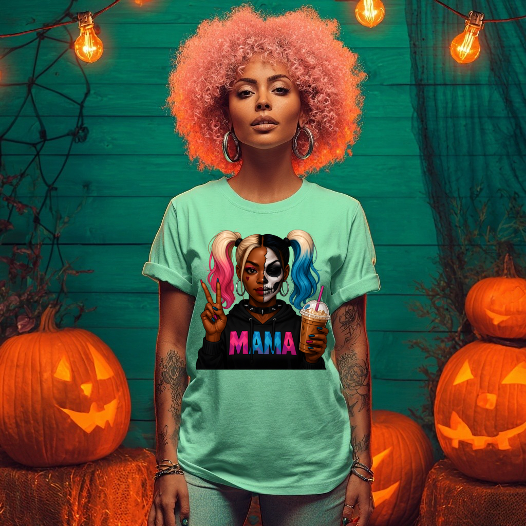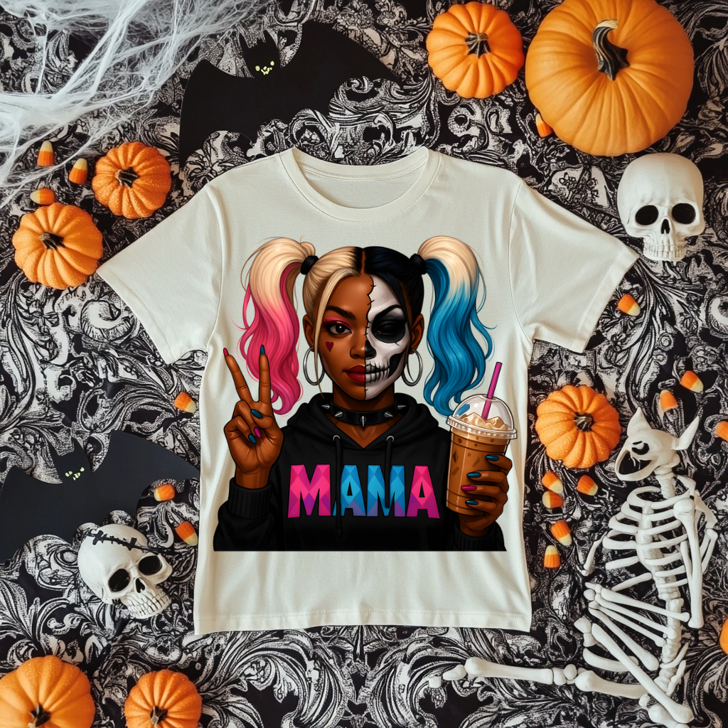 Serve spooky sass with this bold Halloween design! This Afro-punk inspired “MAMA” PNG features a fierce character with split face paint (half glam, half skull), vibrant pink & blue pigtails, and an iced coffee in hand.