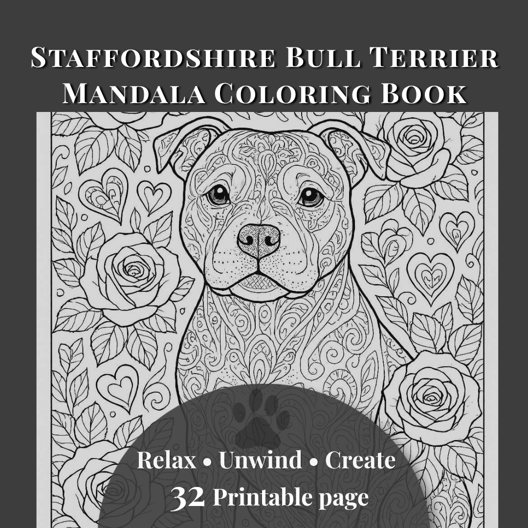 Step into a calming world of Staffordshire Bull Terrier–inspired mandalas and gentle patterns designed to help you relax and unwind.