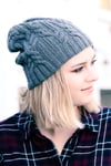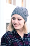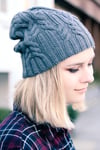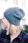 Size: 18.75” brim circumference and 8.5” tall, unstretched, shown on a 22” head. The rib-based pattern is very stretchy and easily accommodates heads from 20- 23” in circumference; to adjust the size further, go up or down a needle size.