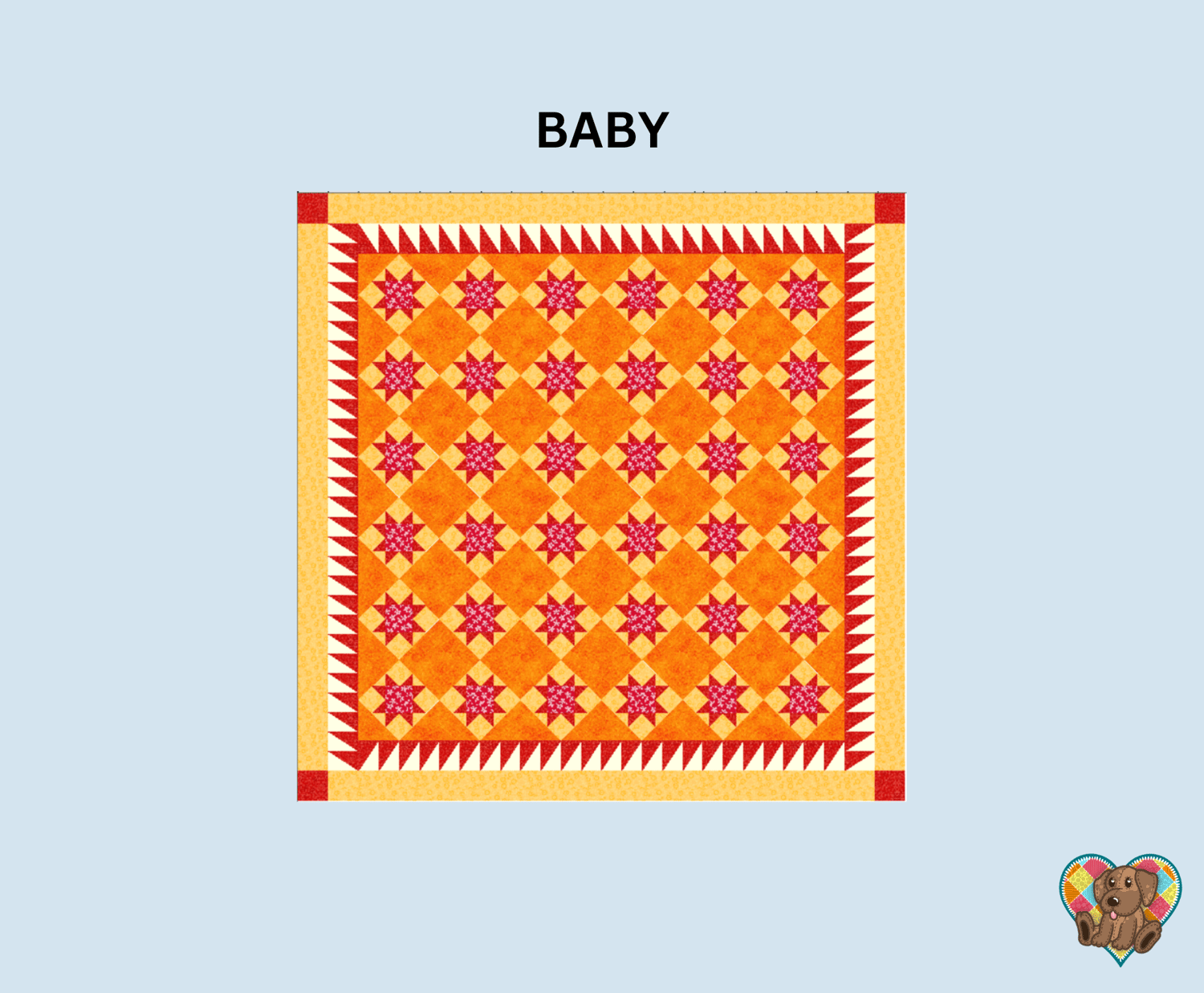 *Note: This pattern includes instructions for a baby (39.82" X 39.82"), lap (67.4" X 77.3"), twin (80.12" X 92.14"), queen (88.61" X 102.5"), and king (109.58" X 109.58") size quilt.* Blocks are traditional pieced diagonal blocks.
