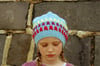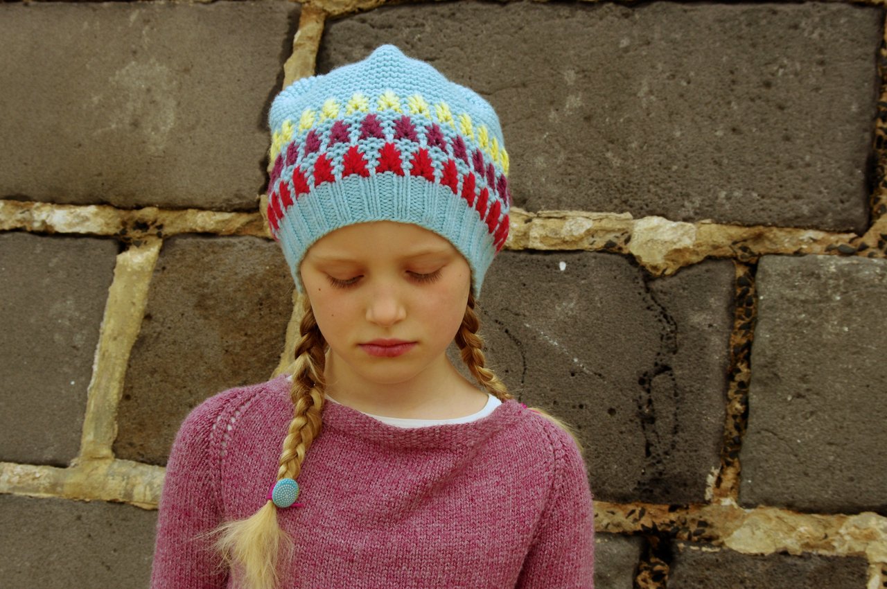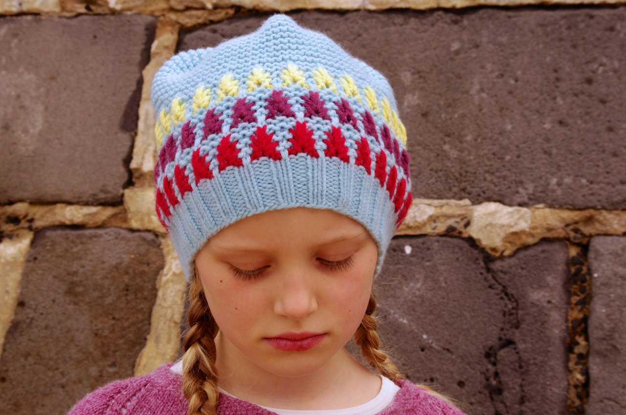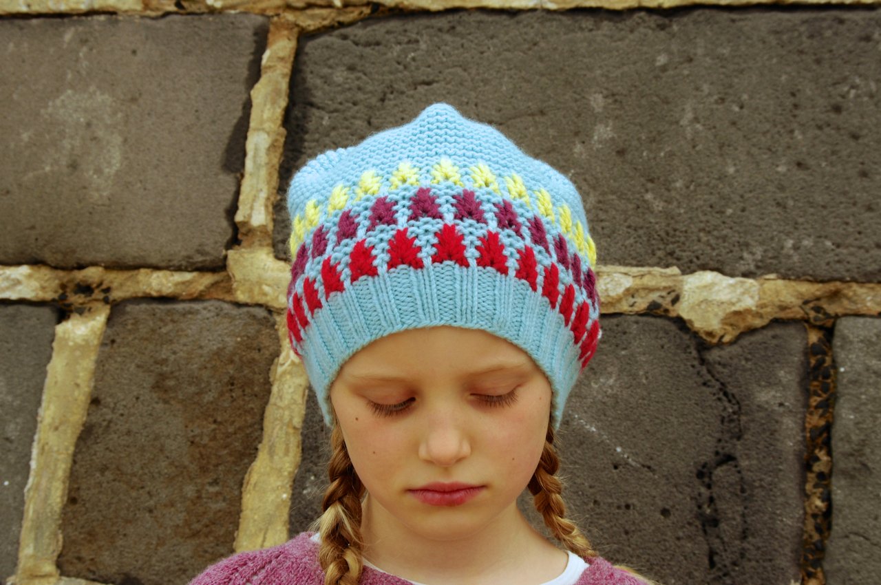 Cherrypool is worked seamlessly in the round from the ribbed brim upwards. The body of the beanie is worked in garter stitch with slipped stitches used to create the flame-like stitch pattern. The crown is decreased dramatically to create a ruched effect.
