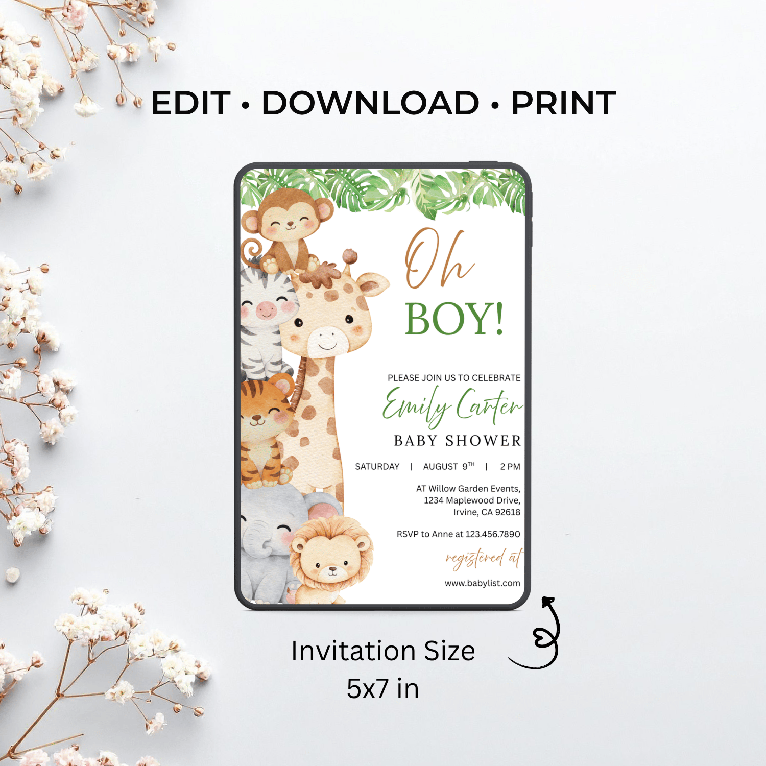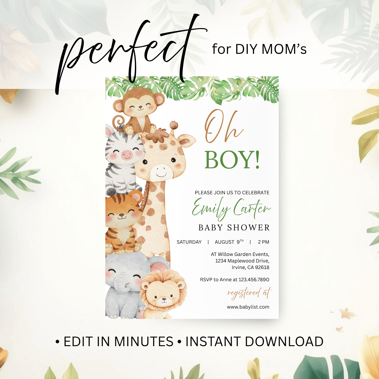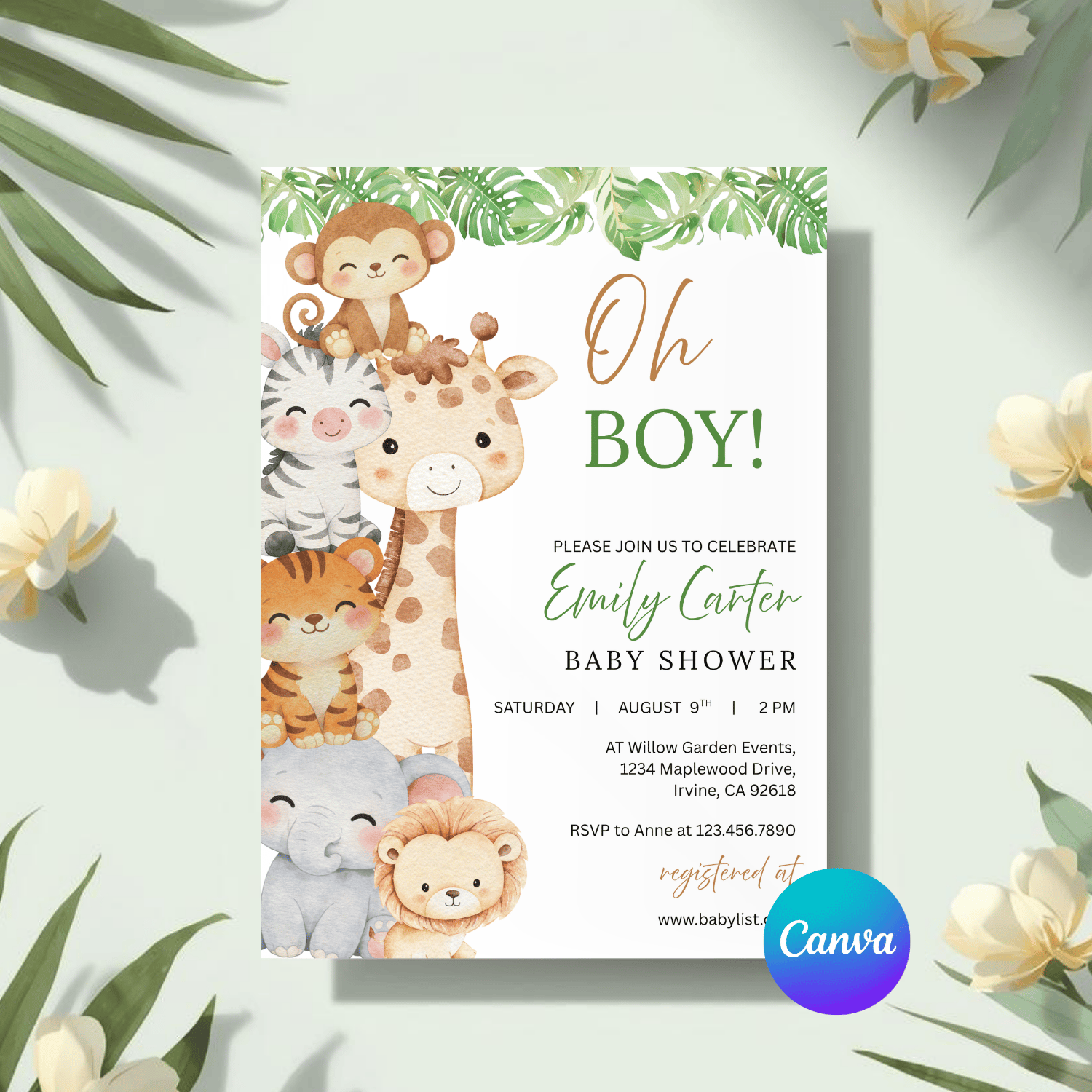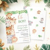 BBY007 Oh Boy! Safari Baby Shower Invitation Template | Jungle Animal Baby Boy Invite | Editable Text in Canva | Instant Download