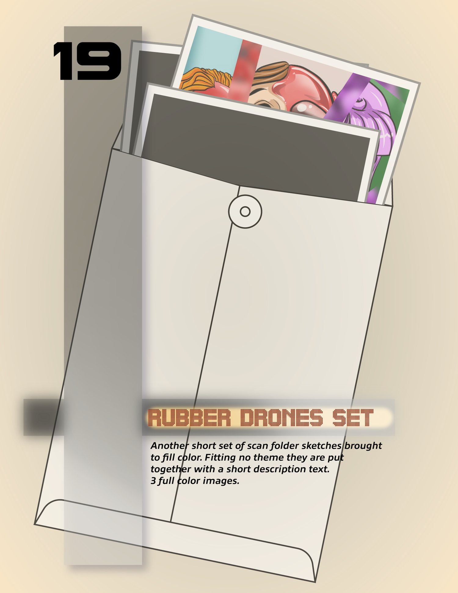 Concepts that have sat in the scan folder for many years. They did not fit any specific art pack and was set aside for other designs. 3 Pieces with rubbery themes in full color and inks. Short description of the three designs included. 9.8 MB