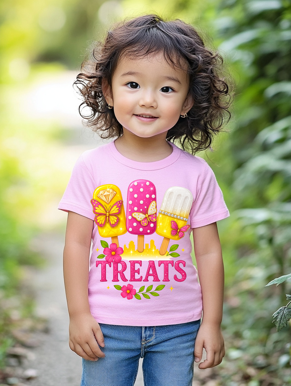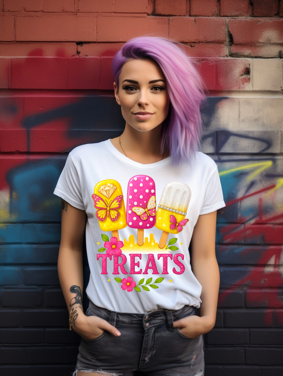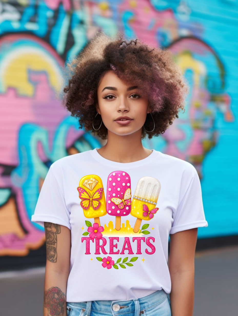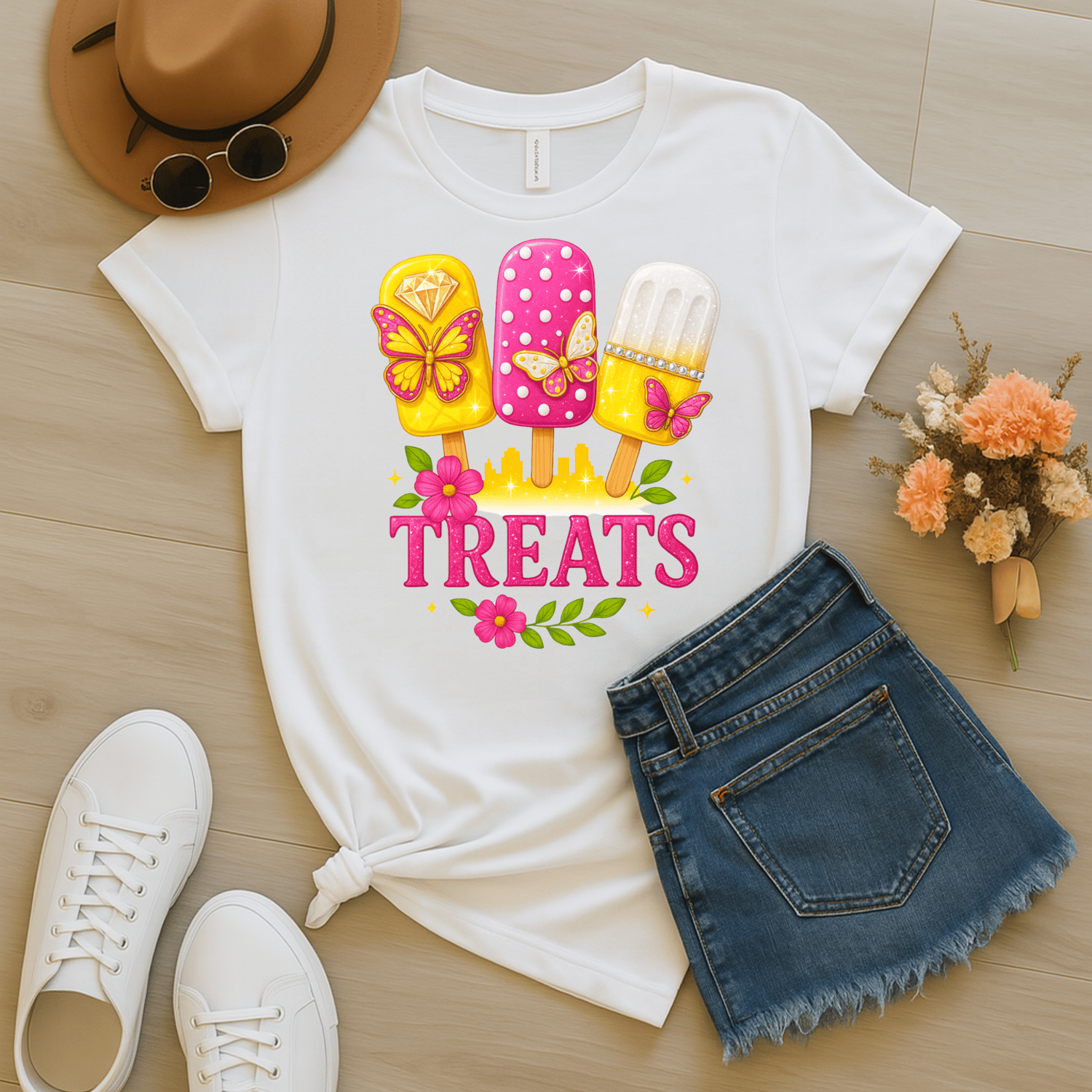 Add some sparkle to your sweet life! This vibrant design features glittery butterfly popsicles in bold pink, sunny yellow, and soft shimmer white—finished with rhinestones, florals, and that “Treatz” pop!