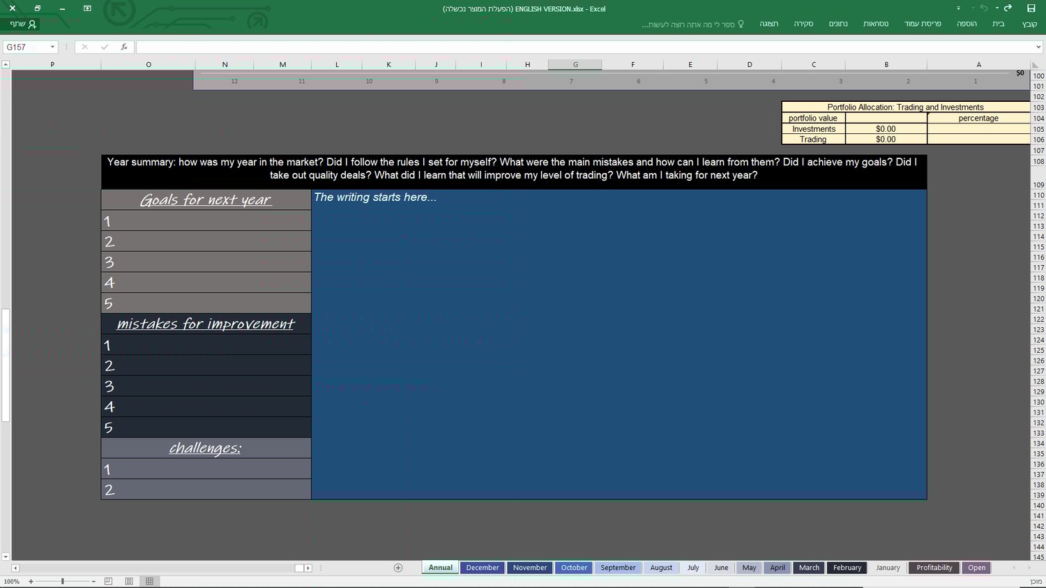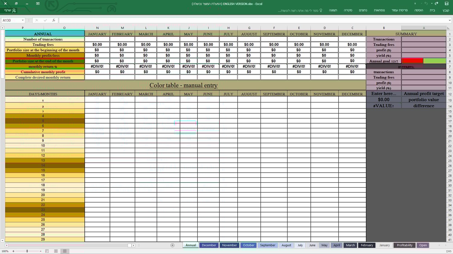 Annual summary: ๐น The most important sheet in the file. Shows us an annual summary of the trades we had. Almost all the cells are calculated automatically and it is important to pay attention not to touch them. In addition, additional tools to help you continue the process such as: a manual color chart, assigning a portfolio plan for trading and investments, a place for a personal aspect - writing a year summary and setting goals for the next year