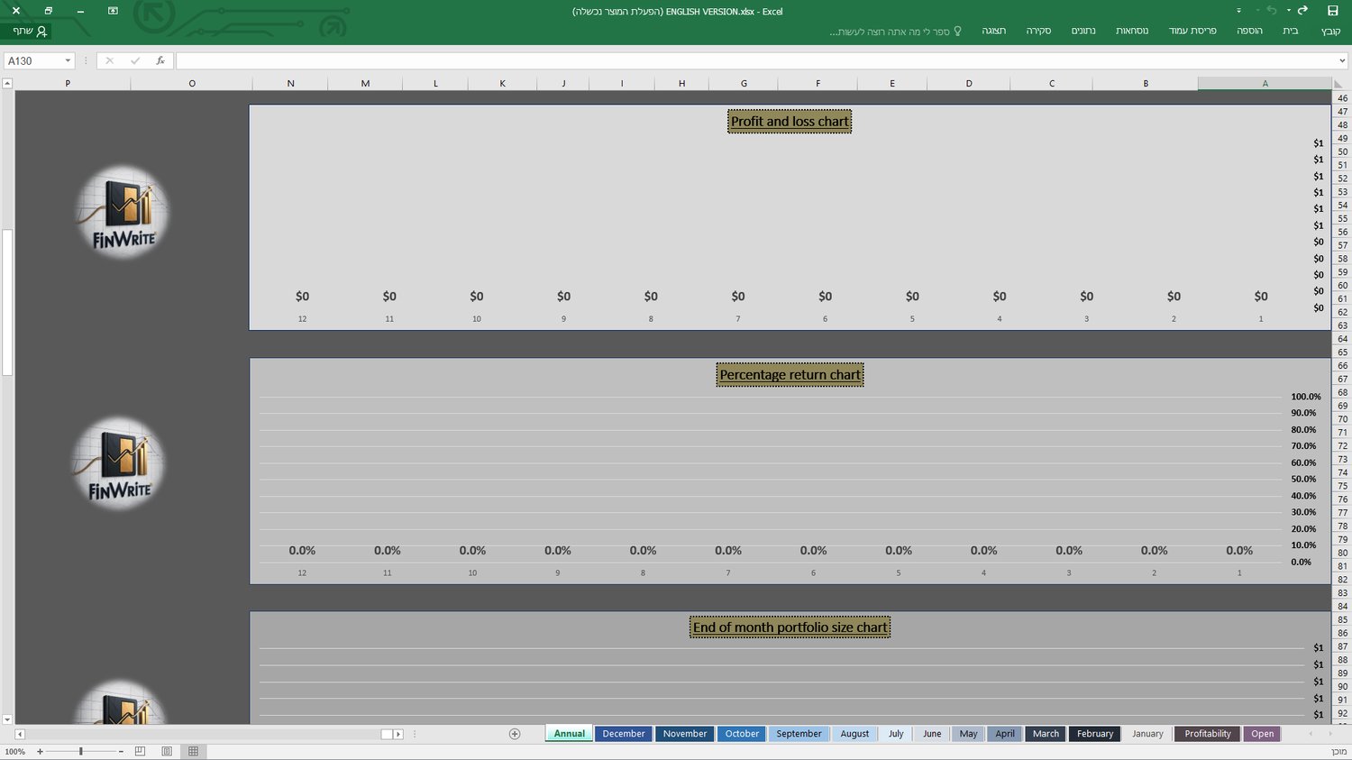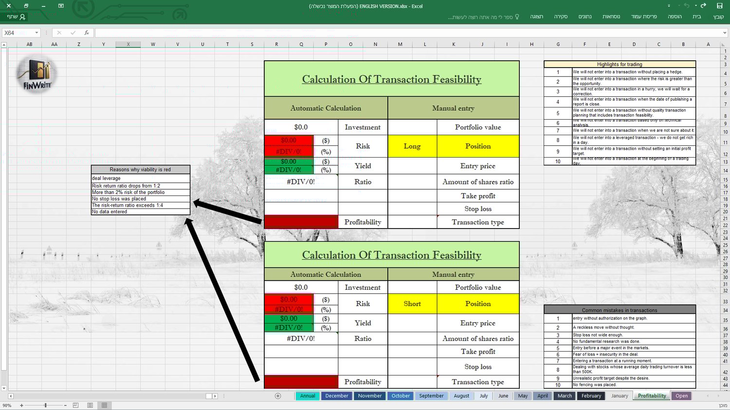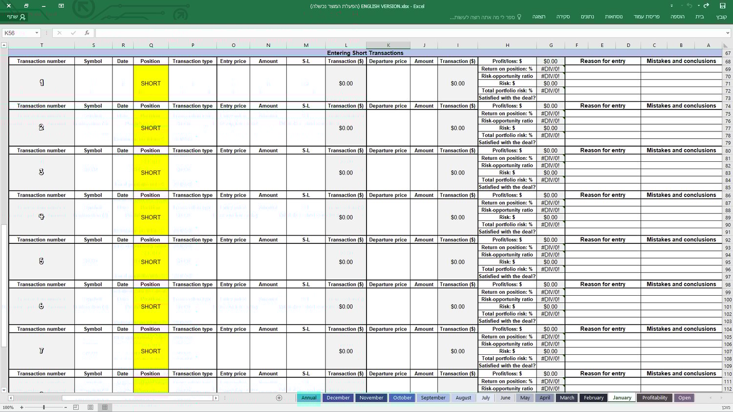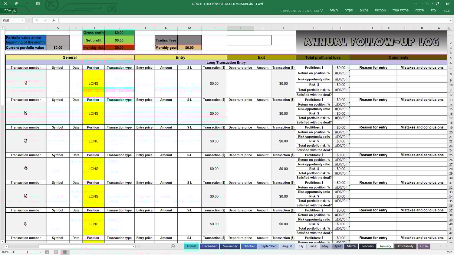 Months of the year "January-December": ๐น Presents you in an orderly manner 20 long and short trades per month, designed at a high level and showing cells for manually entering trades. After you entered manually, you received additional data automatically generated using Excel formulas. For example: monthly return, risk-reward ratio, risk percentages of the portfolio screen, conditional designs and more. In addition, monthly summary cells are automatically calculated according to the trades you made (you can see the images)