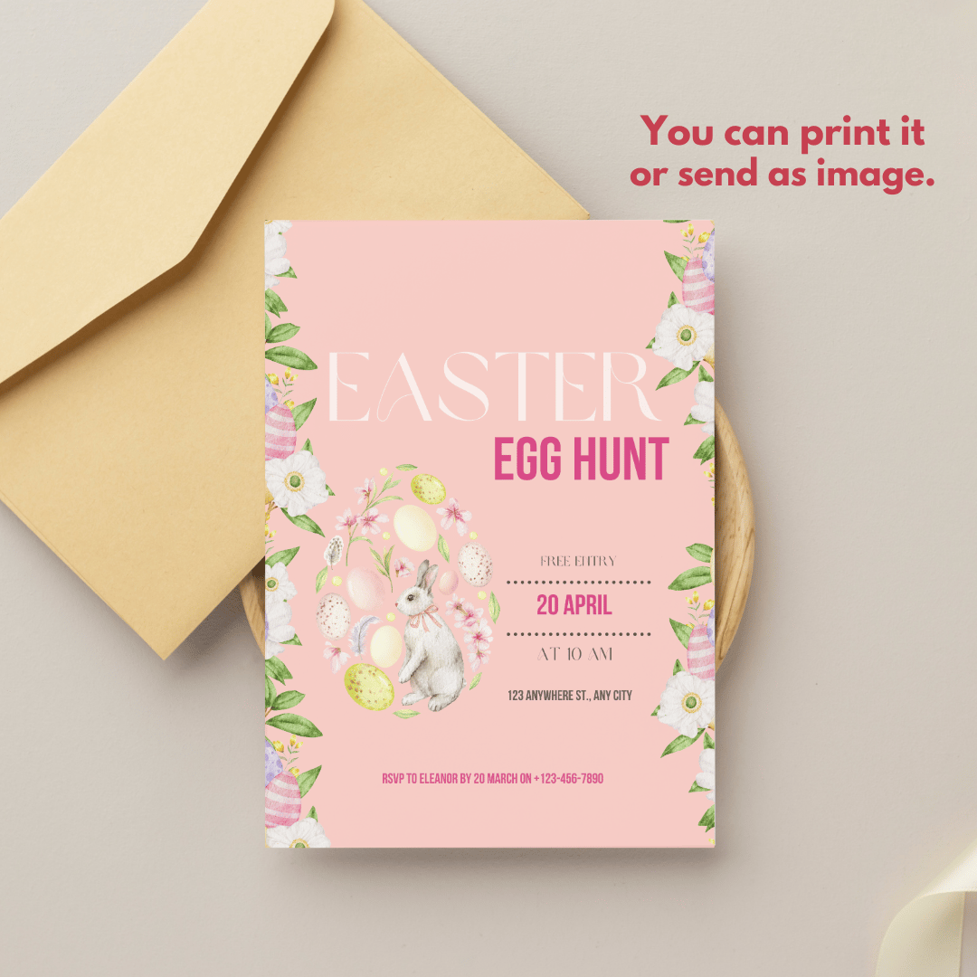 Featuring decorated and painted eggs, a cute bunny, and vibrant colorful details, this design captures the spirit of April and the joy of rebirth. Perfect for gathering family and friends, this editable template allows you to add your own text and customize it for your event. Whether you print it out or send it as a message, this printable download is an ideal way to invite loved ones to join the fun. Happy Easter! 🐇🌸