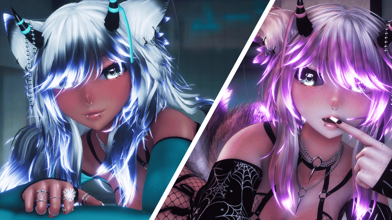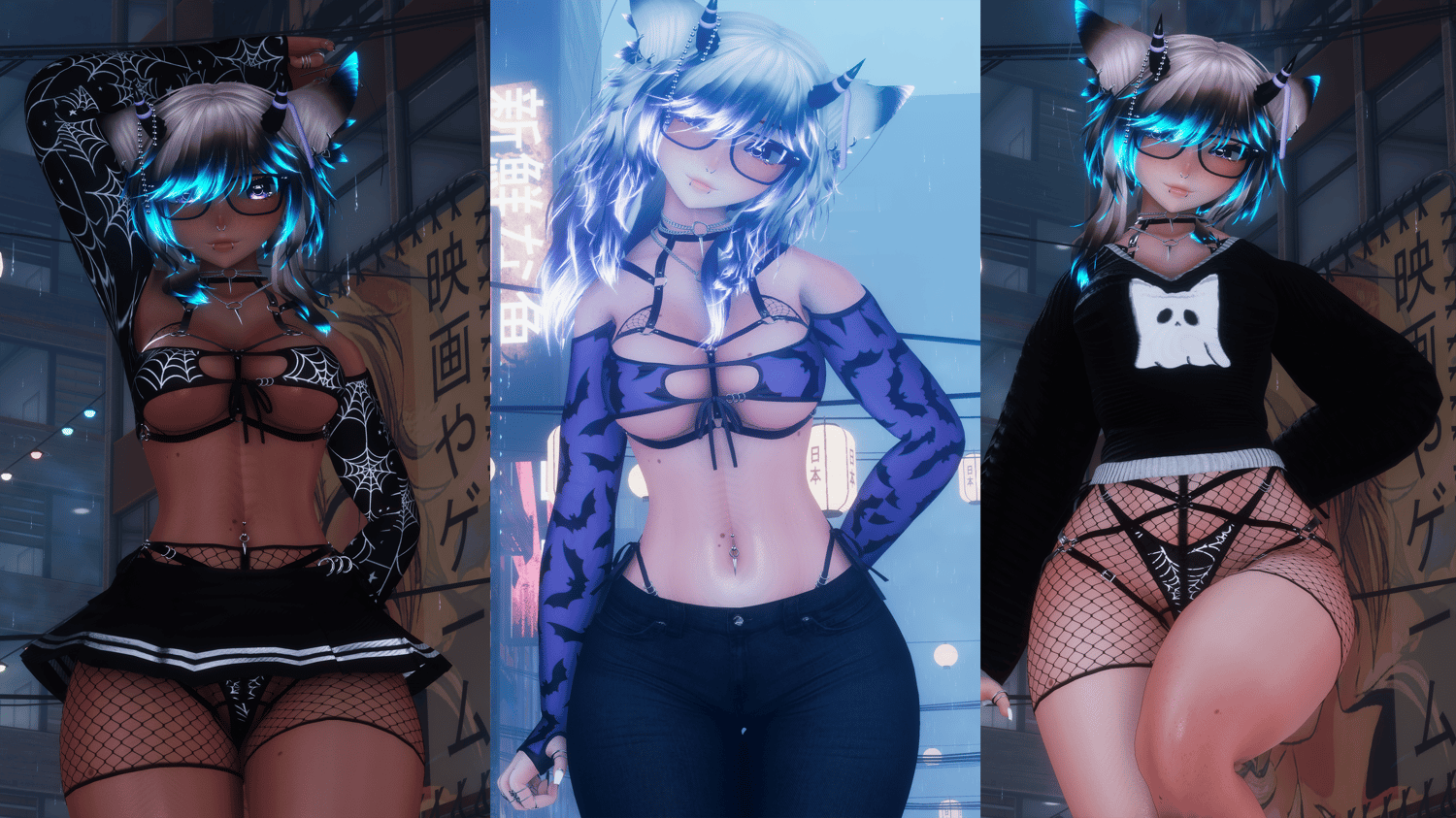 Base (No Reuse) | Head (No Reuse) | Body Texture | Eye Texture | Hair Texture | Hair Maps| Eyebrow Texture | Wholesome Addon's | Face Texture | Nail Texture Ivy_Creates | Matcaps | Hair Nessy!#7402 | Hair | Ears Love#1624 | Glasses | Outfit | Tail | Horns | Horns Addon | Skirt | Skirt Addon | Harness | Socks | Sweater | Shoes TheThiccwitch#2396 | Jeans | Rings | Piercings | Stepping Effect | Fake Index | Face Tracking Addon | GogoLoco | Contacts| Icons |