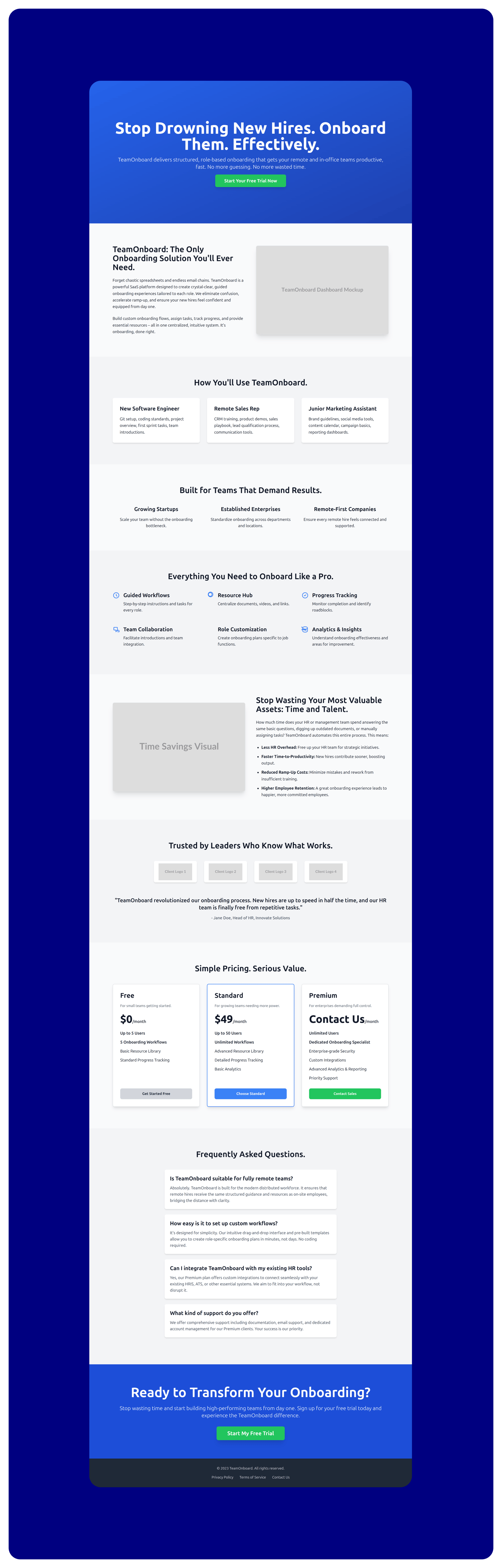 TeamOnboard — Employee Onboarding SaaS Landing Template (Professional HR Tech Branding)