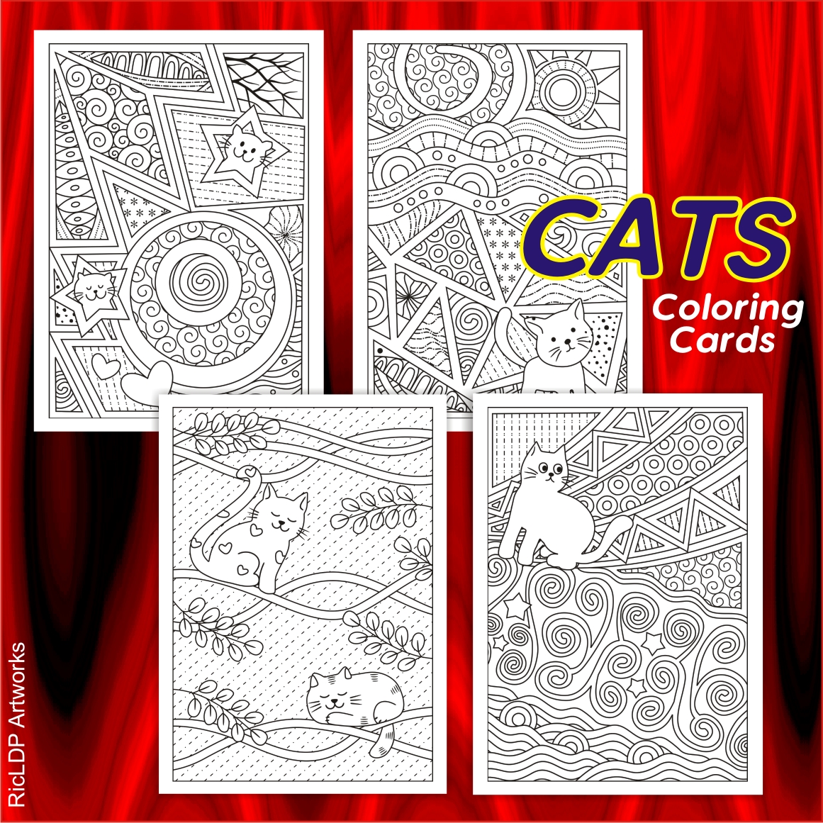Cats Zentangle Art Coloring Cards - A Printable Set of 8 for Relaxation, Stress Relief & Creative Expression