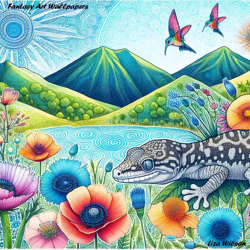 Colourful Gecko beside a lake with humming birds, mountains, & flowers. Spirograph style patterns.