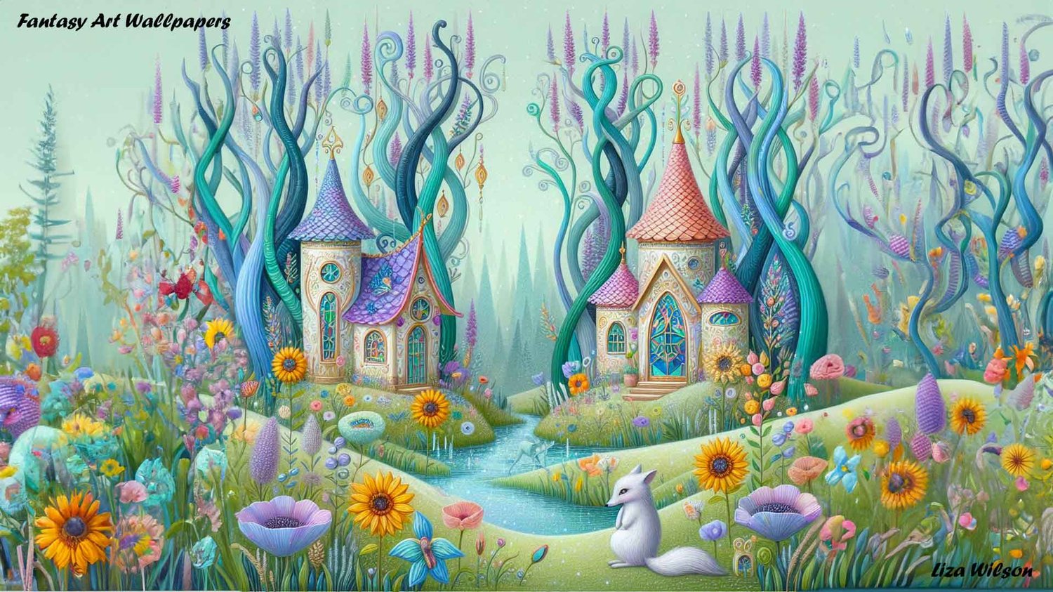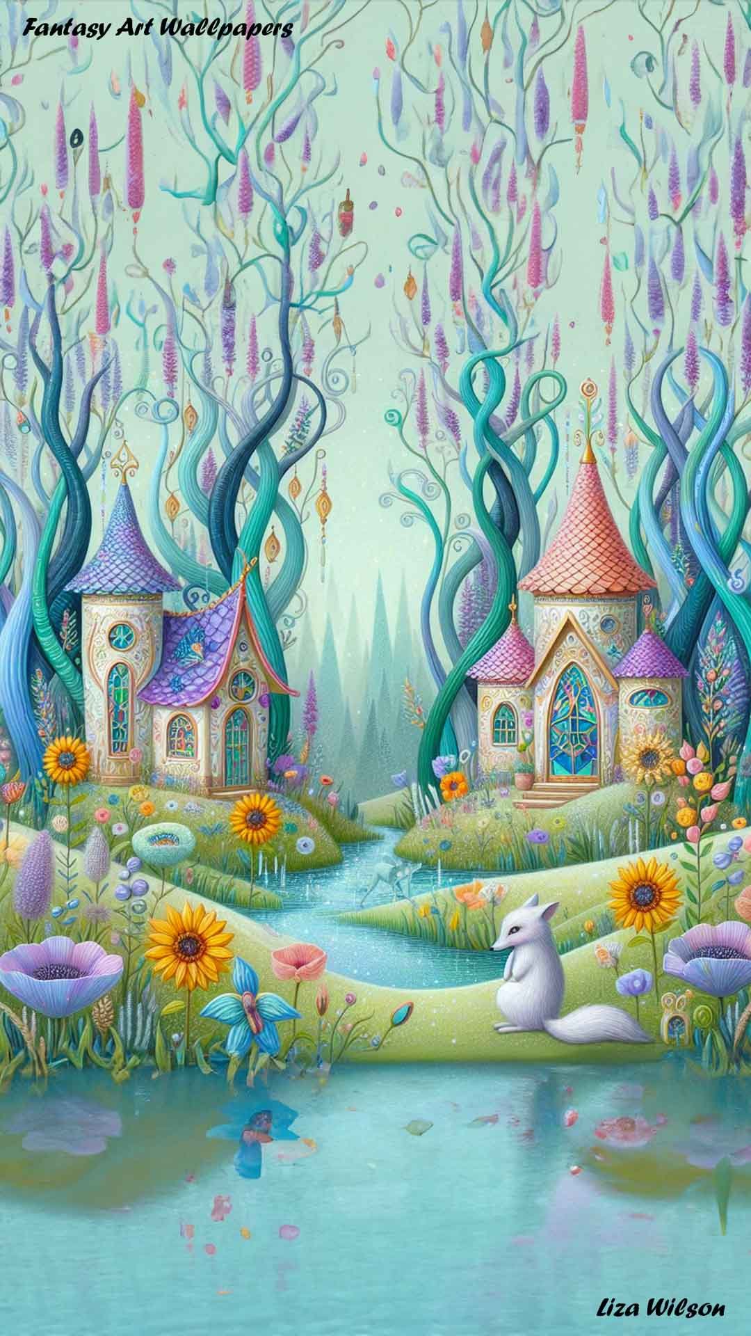 Whimsical fairy houses in a misty green forest with tall twisty trees. There are poppies & sunflowers & a tiny whimsical white fox beside a sparkling lake. There are beautiful birds.
