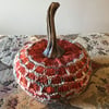 Jack-Be-Little is a variety of tiny pumpkin readily available each Fall.  This Jack-Be-Little knits up quickly and is made with slipped stitches.   The pattern also includes Jill-Be-Little (another variety) and Ghost-Be-Little (slight poetic license taken here).  The options vary only in the height of the central slipped stitch section of the pumpkins.  In Jill-Be-Little, all sections are the same height.  In Jack-Be-Little, the middle section is two stitches taller, and in Ghost-Be-Little, four stitches taller than the other sections.