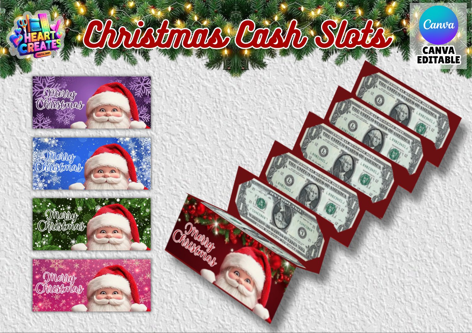 This Christmas-themed cash slot is a festive and foldable money envelope designed for holiday gift-giving. It features a stylish and functional design that can be easily customized and edited using Canva. The envelope is available in five vibrant colors: red, green, blue, purple, and pink. Perfect for sharing holiday cheer, it adds a colorful and personal touch to your Christmas gifts.