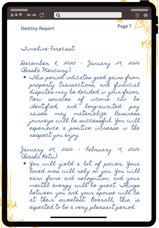 Your Destiny Report is a personalized, in-depth astrological forecast based on your unique Kundali. I personally examine your birth chart to create a comprehensive 5-year roadmap that goes beyond simple sun signs, giving you a true look at the cosmic energies, opportunities, and challenges shaping your future.