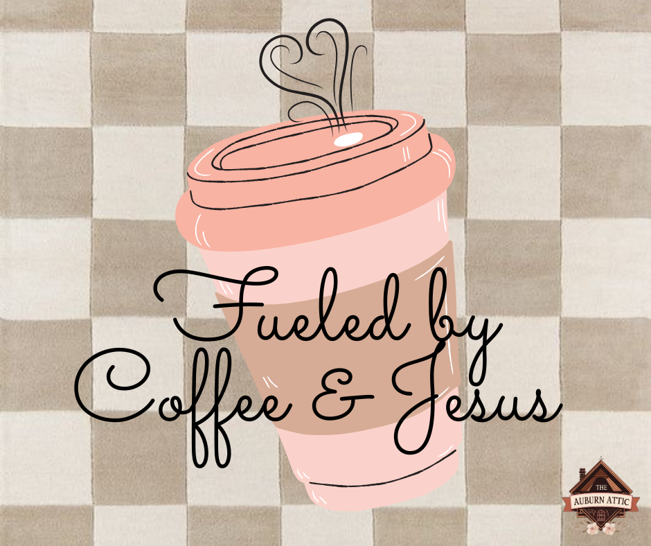 Perk up your social media posts, desktop or workspace with our charming 'Fueled By Coffee And Jesus' wallpaper or printable! This delightful design features a cute pink coffee cup, brimming with your daily dose of motivation. Set against a chic beige checkered background, it's a gentle reminder of the two things that keep you going - your faith and your caffeine! Remember, with coffee in one hand and faith in the other, you're unstoppable!"