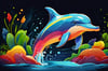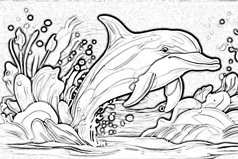 The cover features a vibrant underwater scene, with playful dolphins leaping through crystal-clear waves against a backdrop of coral reefs and tropical fish. The title, "Dive into Dolphin Dreams," is written in a playful font, adorned with bubbles and seaweed.
