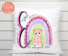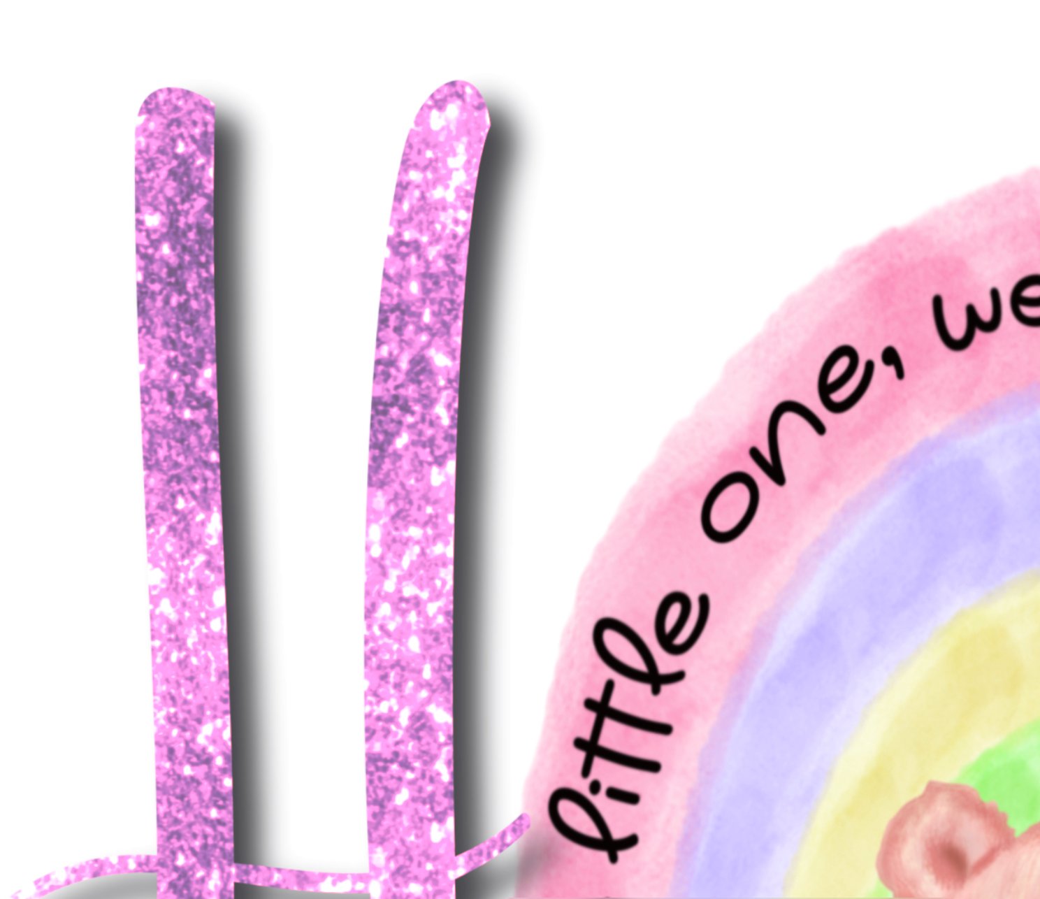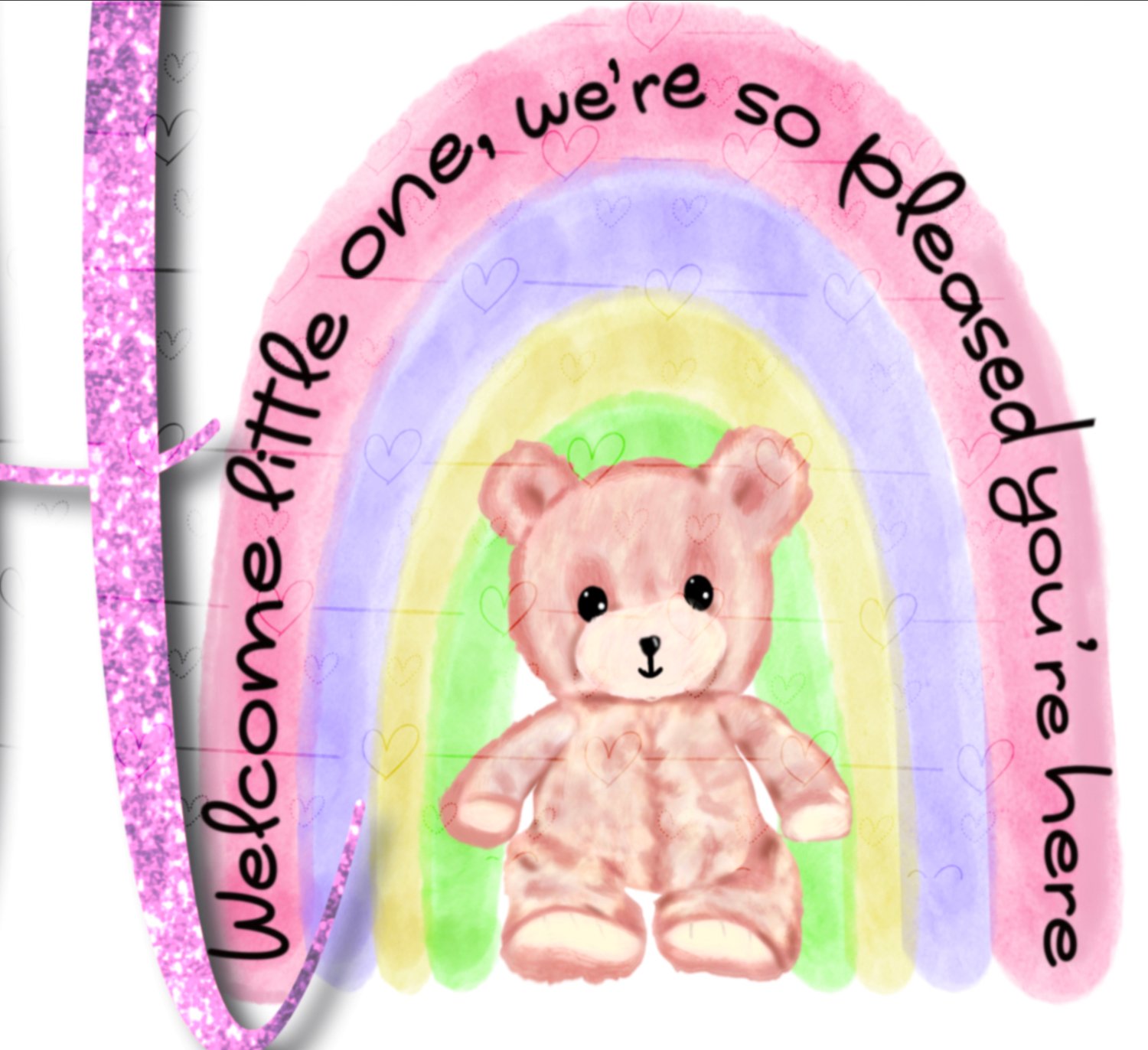 ‘Welcome little one, we’re so pleased you’re here’ pink glitter alphabet with hand drawn bear and rainbow