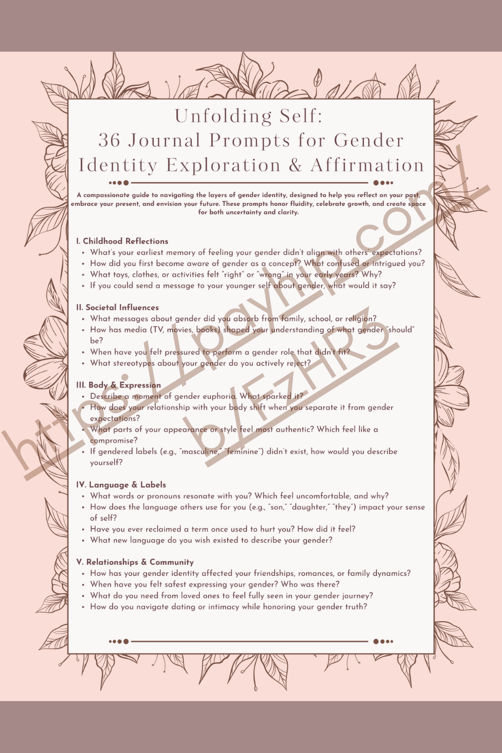 A compassionate guide to navigating the layers of gender identity, designed to help you reflect on your past, embrace your present, and envision your future. These prompts honor fluidity, celebrate growth, and create space for both uncertainty and clarity.