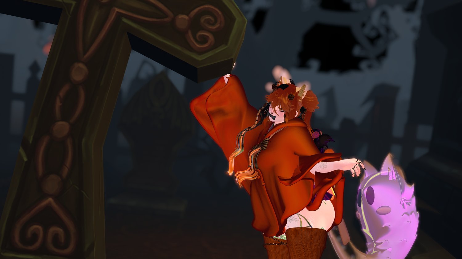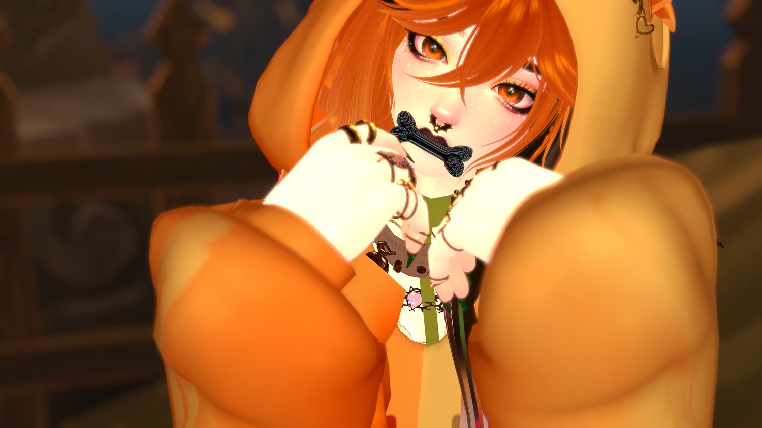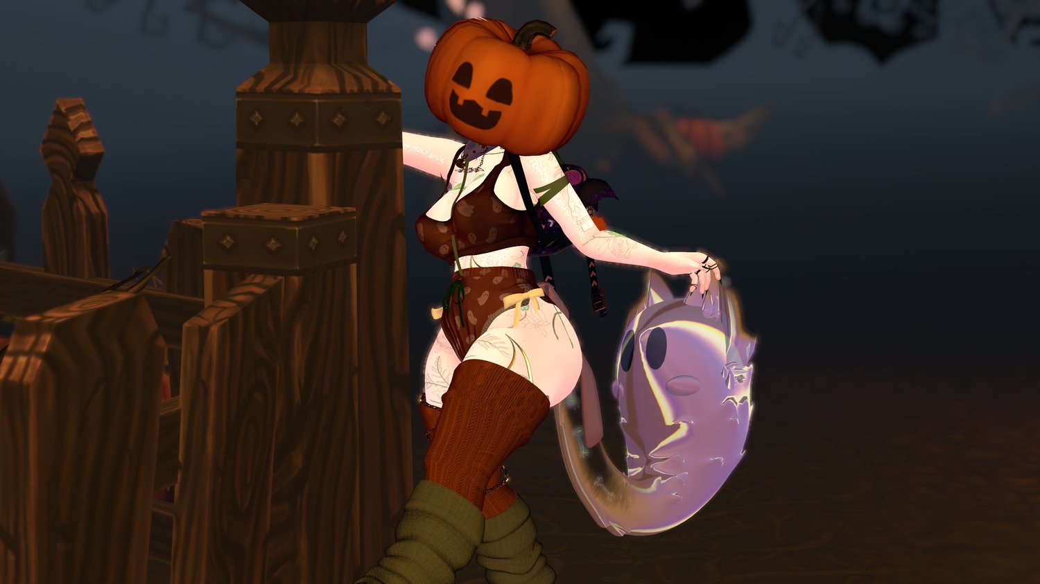 Toggles: Bodysuit, bra, shorts, skirt, panties, pupkin cover, pasties, cloak, hoodie, Hair: Braided pigtails> short bob> single braid> pigtails, hair extra: bangs>buns, Puppy ears, cat ears, cat ghost tail, spirit chain tail, thighhighs, legwarmers, leg chain, face stickers, dog bone, mouth ghost, pumpkin head, slippers,