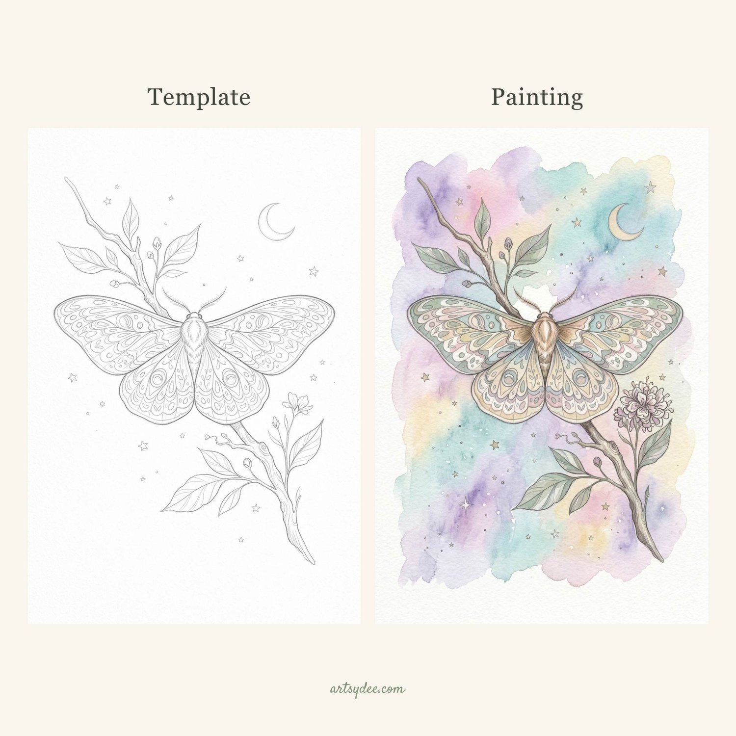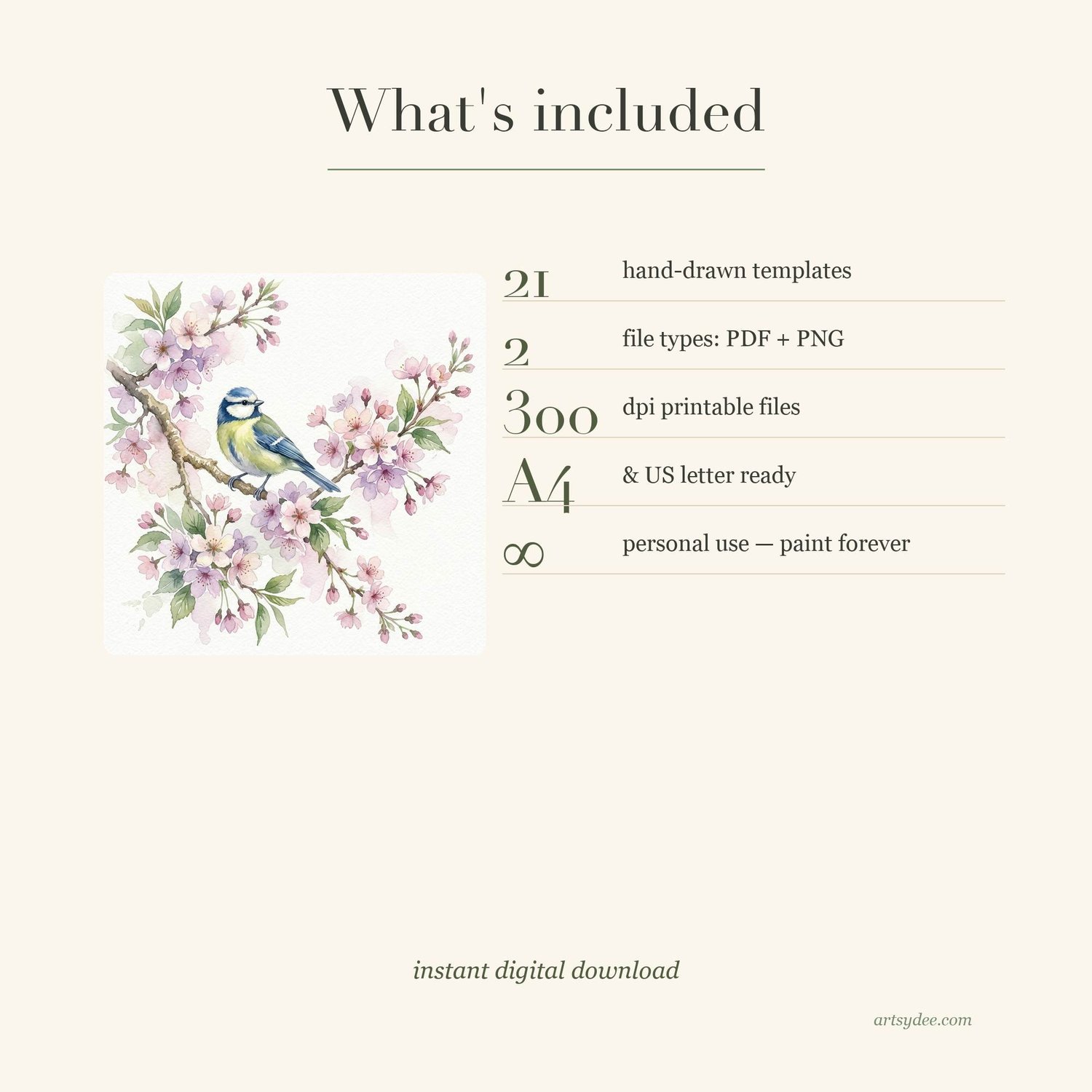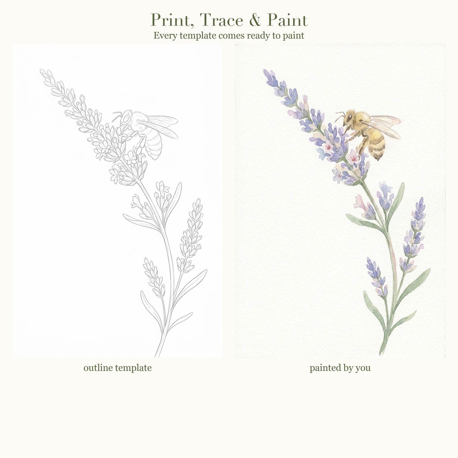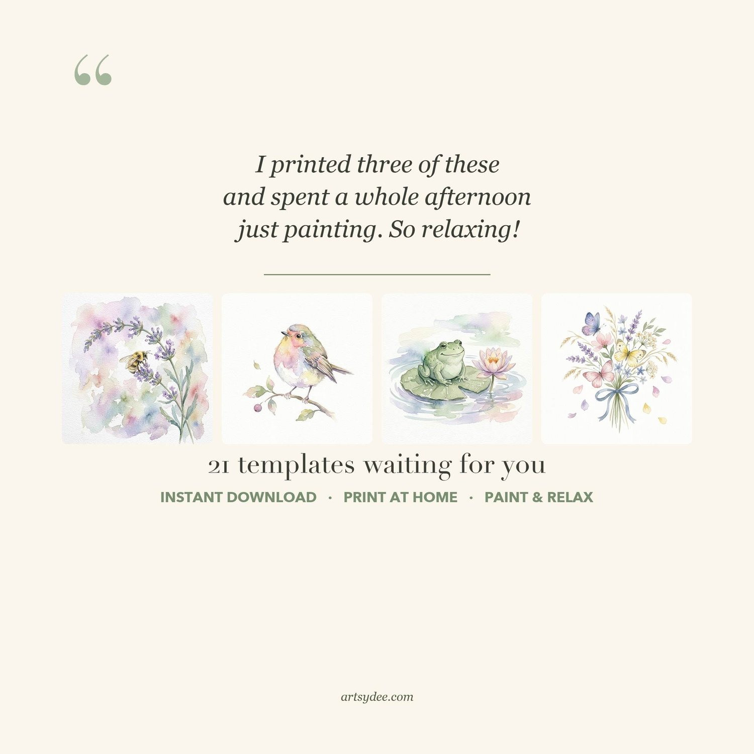Each template is beautifully hand-drawn with generous open areas so you can paint freely — whether you're a total beginner or a seasoned watercolourist wanting something relaxing to work on.