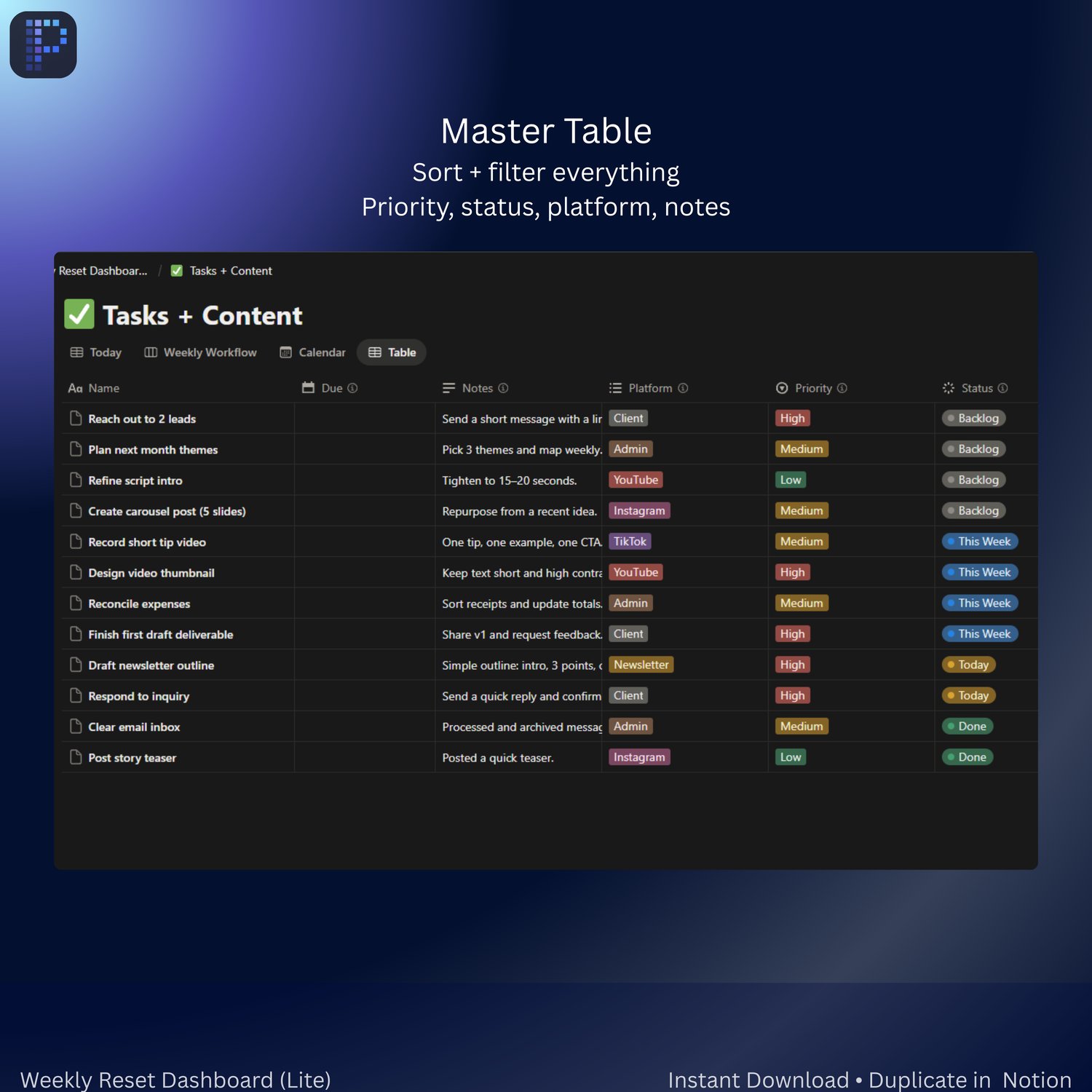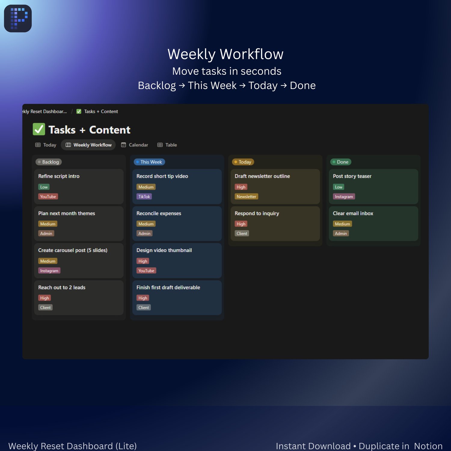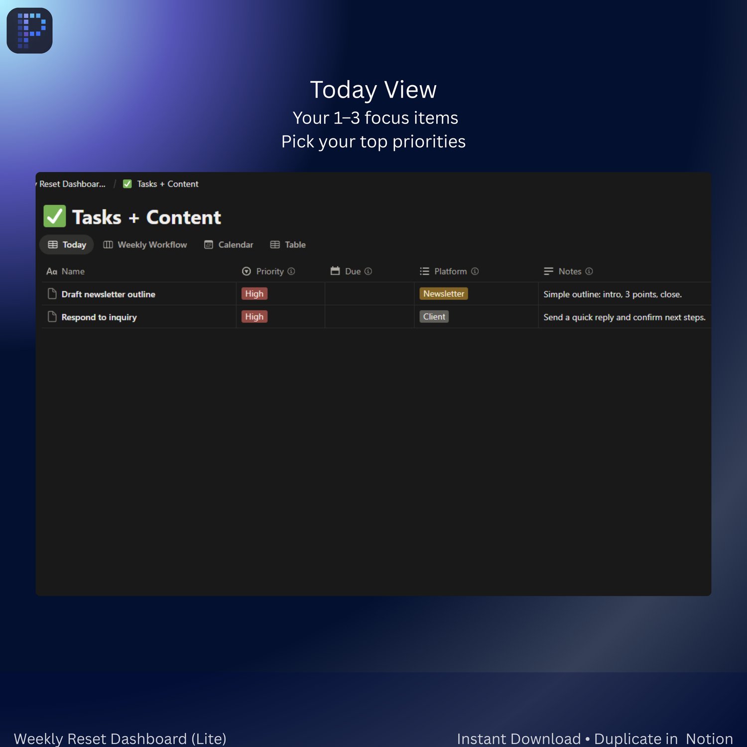 Weekly Reset Dashboard (Lite) is a lightweight Notion system that helps you plan your week in ~10 minutes, capture tasks + content ideas in one place, and focus on 1–3 priorities per day.