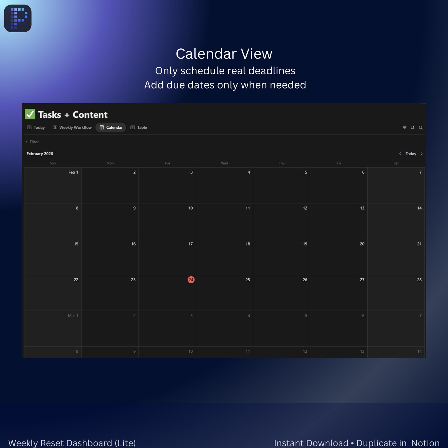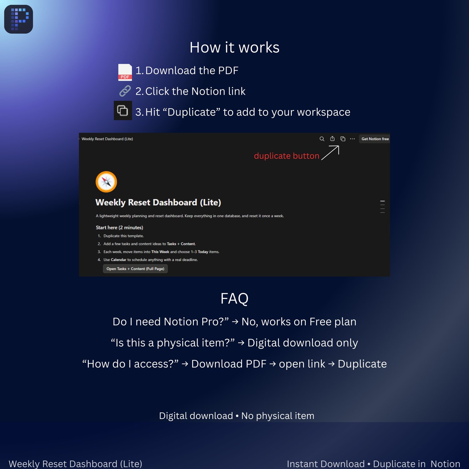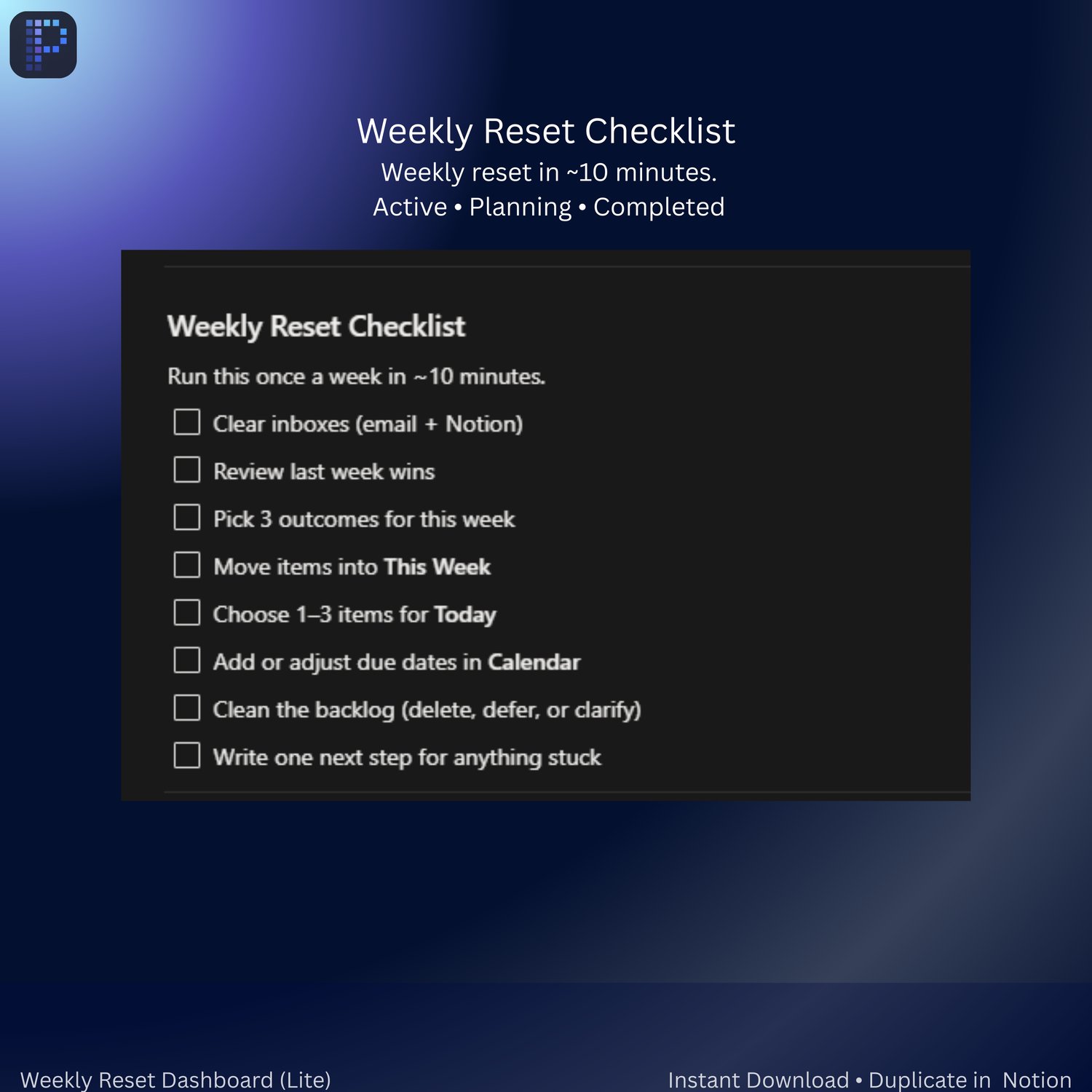 Weekly Reset Dashboard (Lite) is a lightweight Notion system that helps you plan your week in ~10 minutes, capture tasks + content ideas in one place, and focus on 1–3 priorities per day.