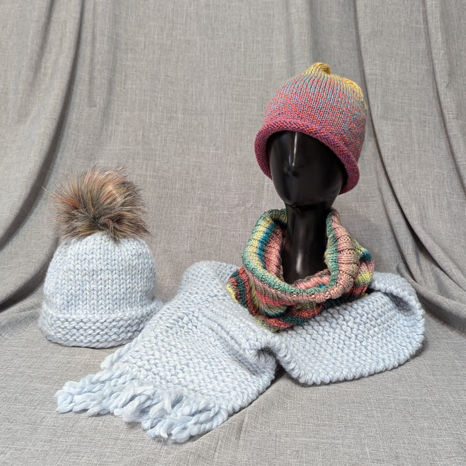 Four patterns designed and written with the beginning knitter in mind. If one starts with the Begin Scarf, and works through all four patterns, the new knitter will have skills to start a more complicated pattern with a firm foundation in basic skills.