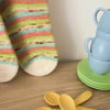 For the bright pair with the stocking stitch scallop I used Down Sheepy Lane Self Striping with Stellina 75% superwash merino, 20% nylon, 5% silver stellina in colourway ‘Life’s a Peach and pale pink (cc1) and white (cc2) 75% superwash merino, 25% nylon for CC1 and CC2.