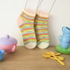 The focus of these socks is the pretty layered cuff. There is no sewing involved to join the layers together, just knitting. The socks are worked with a short row heel so that the stripes on the self striping yarn isn’t interrupted but these socks could be knit in endless combinations of colours, stripes or speckles. I can’t wait to see the combinations you come up with.