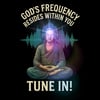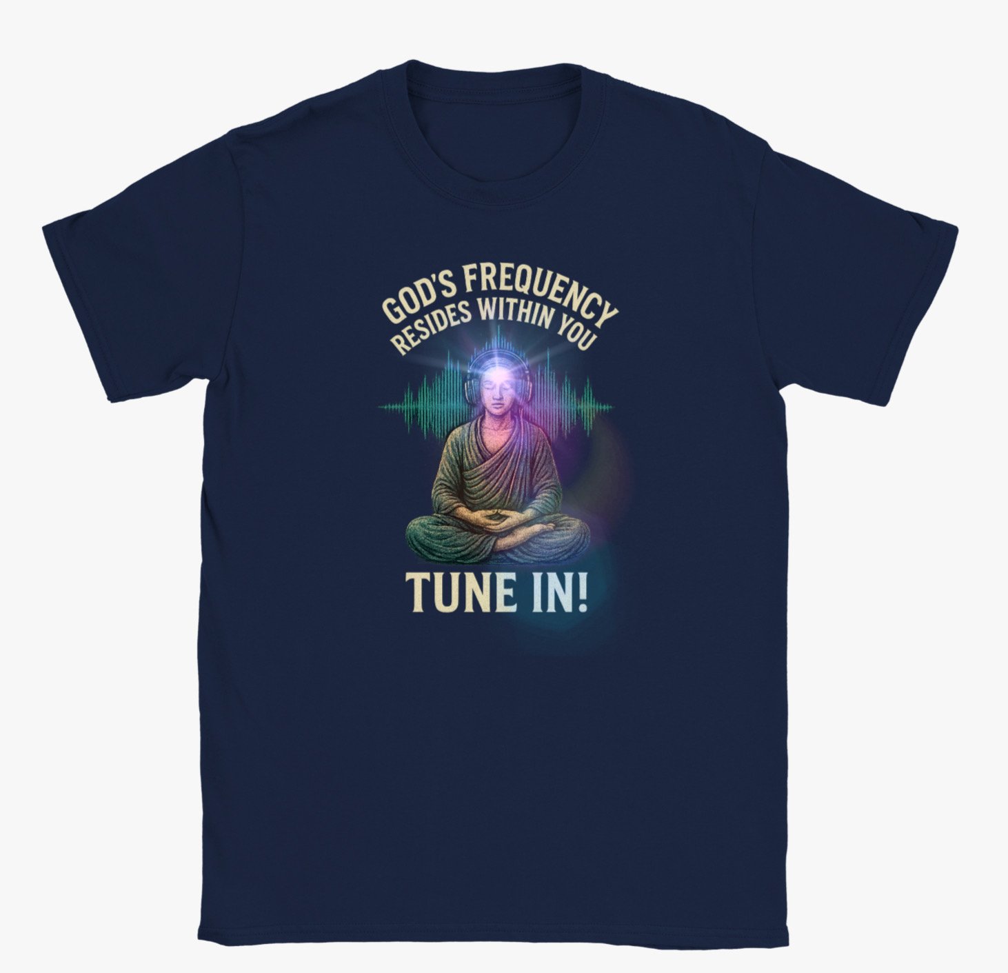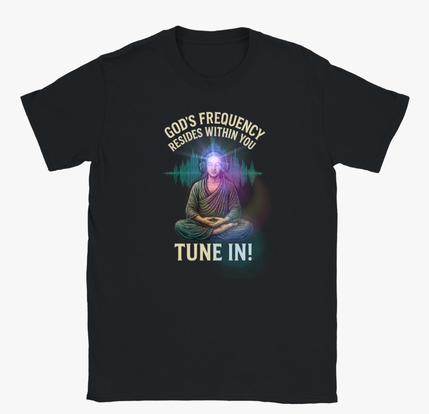 Awaken your inner harmony with our “God’s Frequency Resides Within You - Tune In!” t-shirt. This striking design blends spirituality and modern energy, featuring a serene meditating figure surrounded by radiant sound waves and light - a reminder that divine connection begins within.