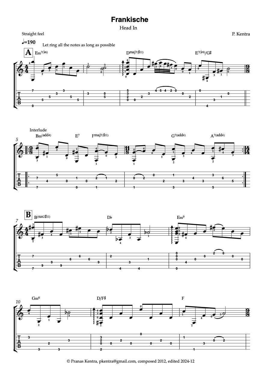 1) Head In (3 pages, exact guitar arrangement notation and tabs)