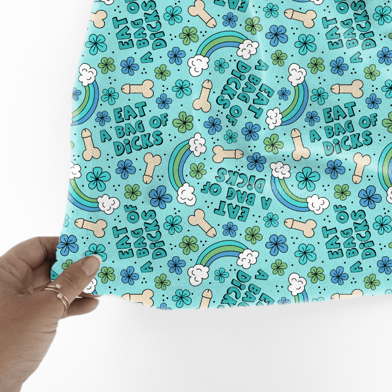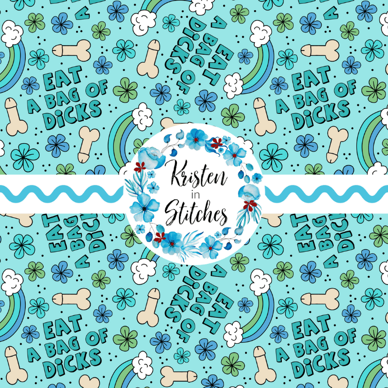 Eat a Bag of Dicks with rainbows and flowers on blue.