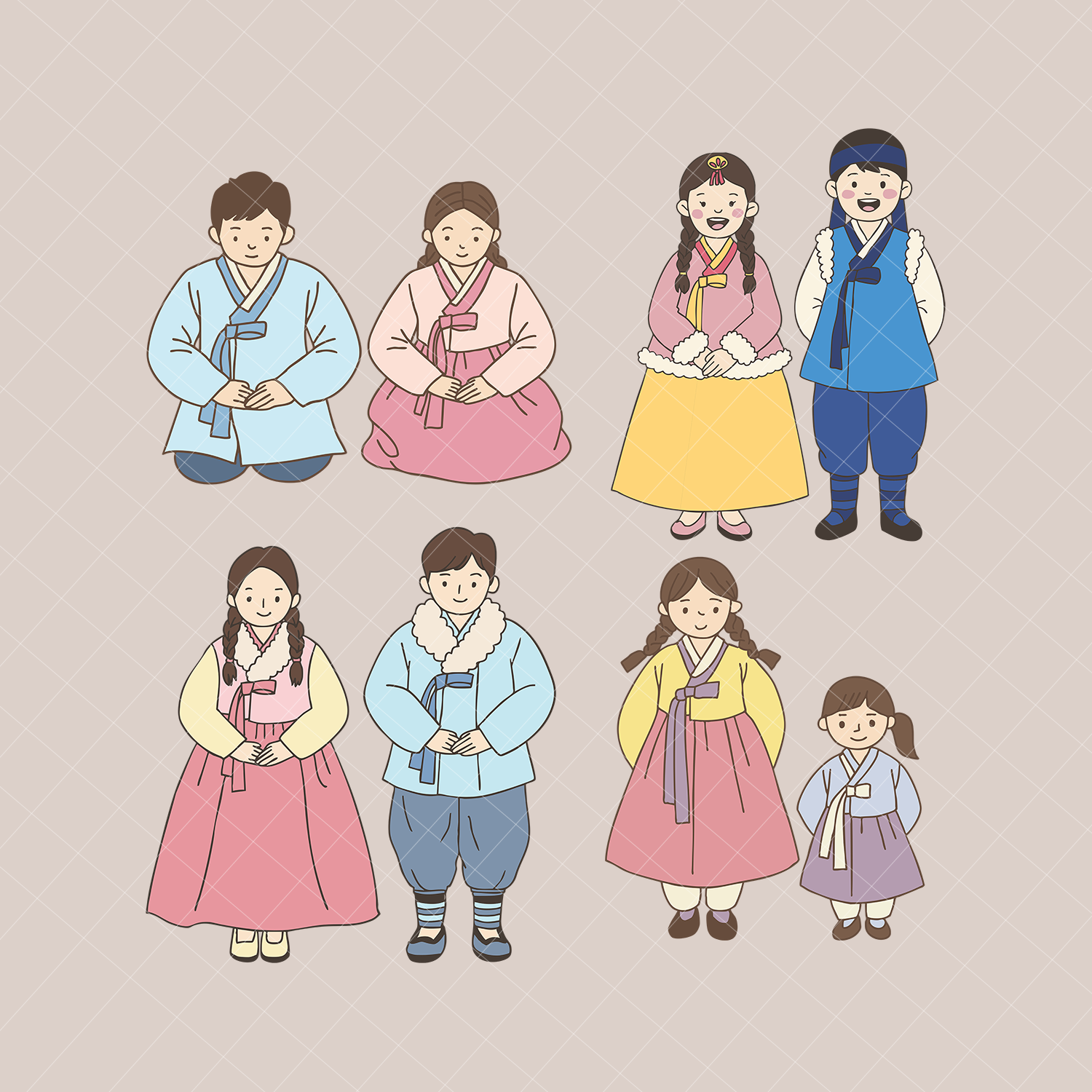Hand-drawn Lunar New Year (Seollal) Hanbok Characters Clipart – PNG & SVG | 8 Illustrations