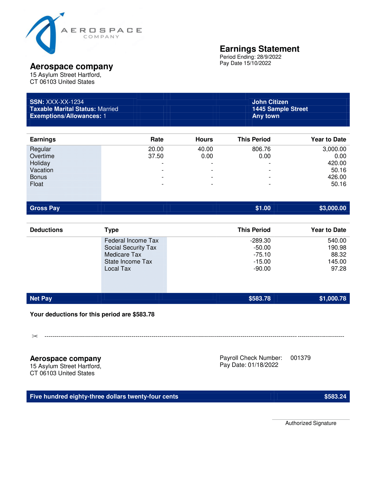 Aerospace company earning statement template in Word and PDF formats