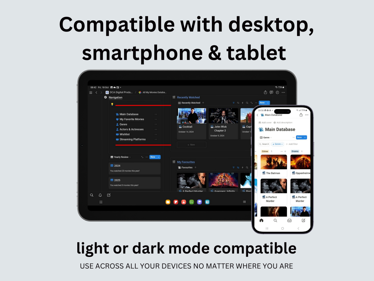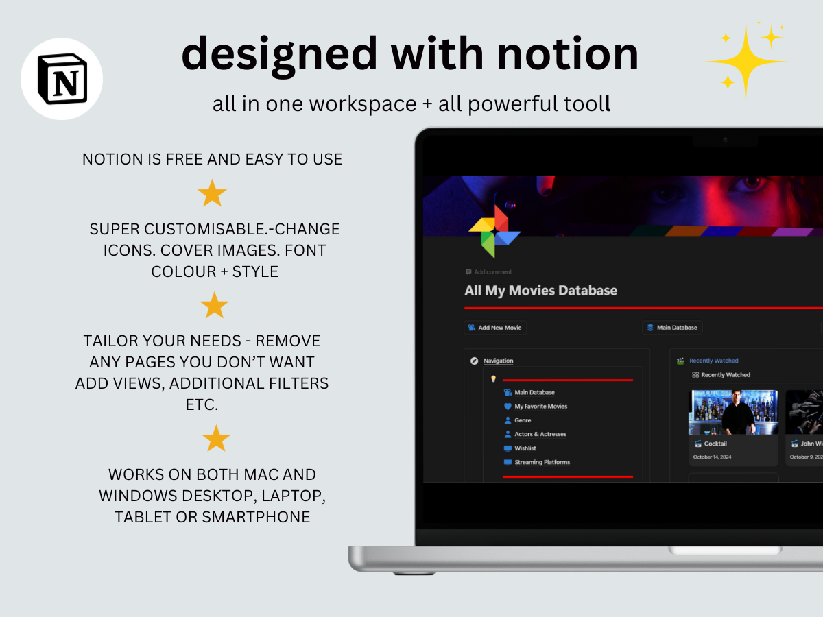 Perfect for staying organized, this Notion template is designed for movie enthusiasts who want to easily keep track of what they've watched. Whether you're binge-watching your favorite movies or exploring new films, this tracker has all the features you need to record and organize your entertainment. Ideal for anyone looking to stay on top of their watchlist, this template is the ultimate tool for movie lovers!