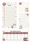 Moreover, there is a four-piece stationery set, including a To-Do List, Memo Pad, Notepad, and Weekly Planner, all featuring a brownish-red color palette. Each item showcases pictures of cats and has a repeating background pattern of little printed paw prints used as a border on every sheet.