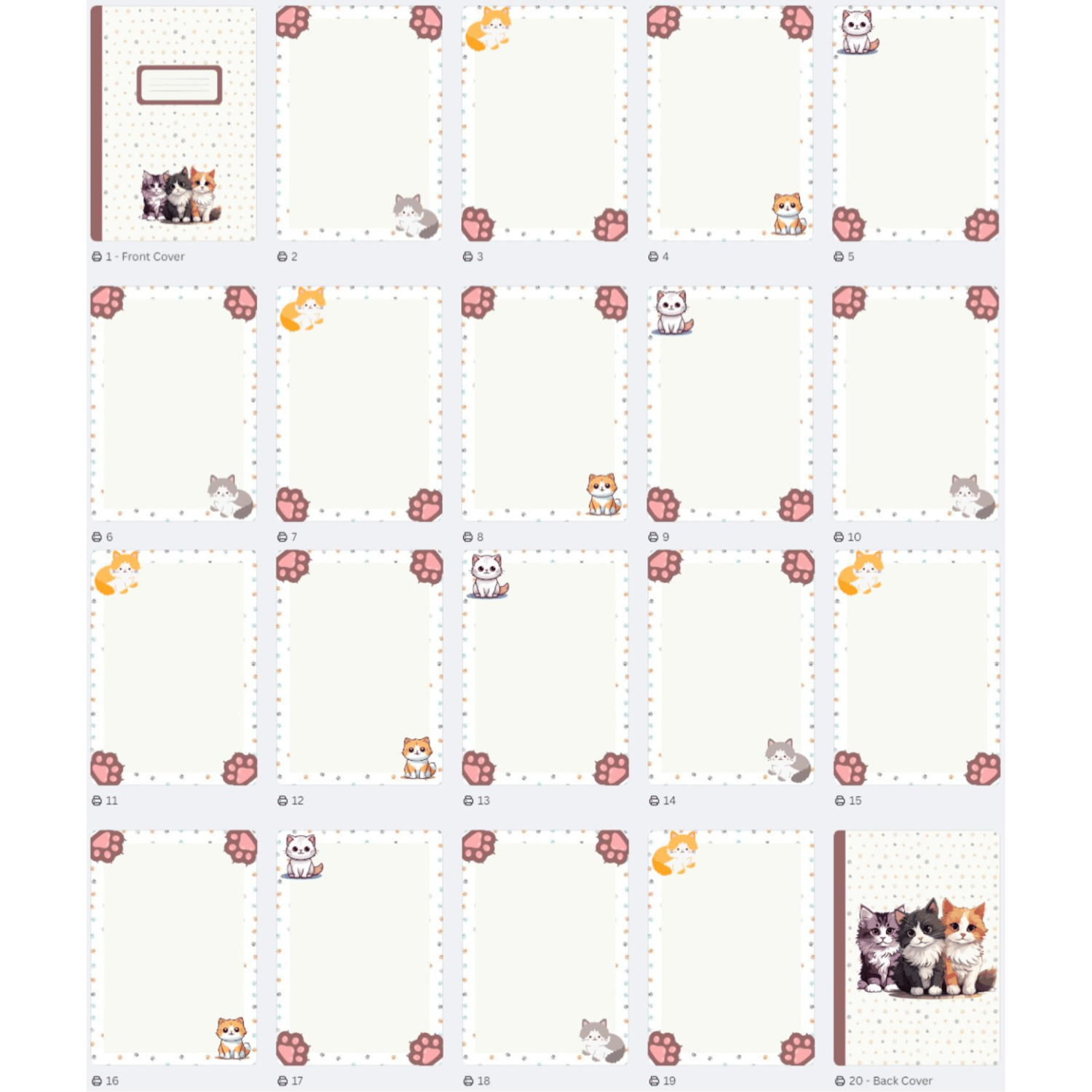 Get ready to doodle with this adorable, brownish-red cat-lover's notebook! Both the front and back feature a cute paw-print background and a picture of three feline friends. Open it up to 20 blank pages, each decorated with a fun paw-print border, a little cat illustration in one corner, and two big paws in the others. It's the perfect unlined space for sketches, lists, or creative musings!