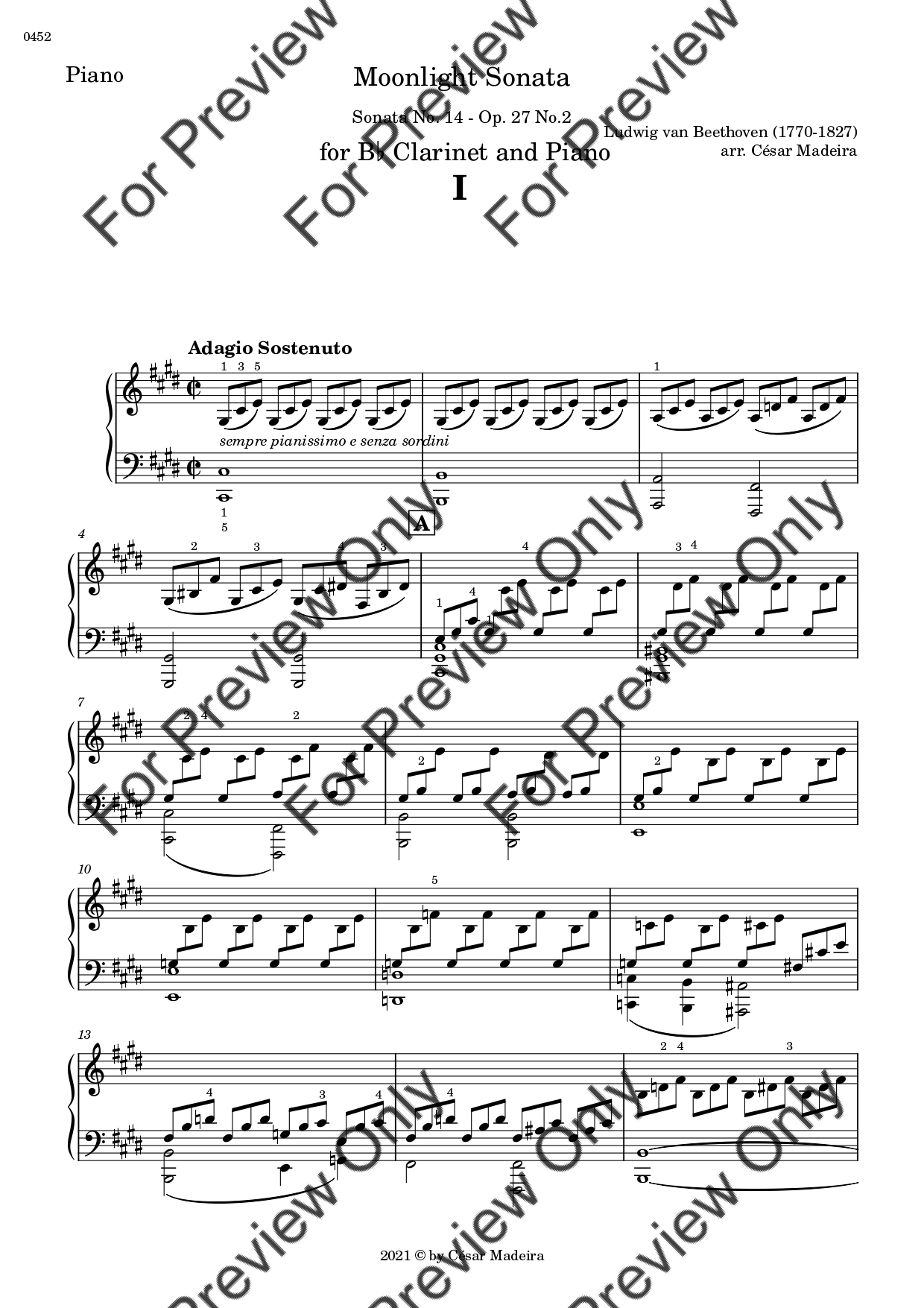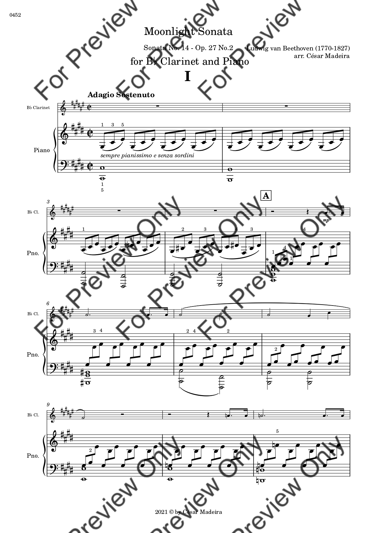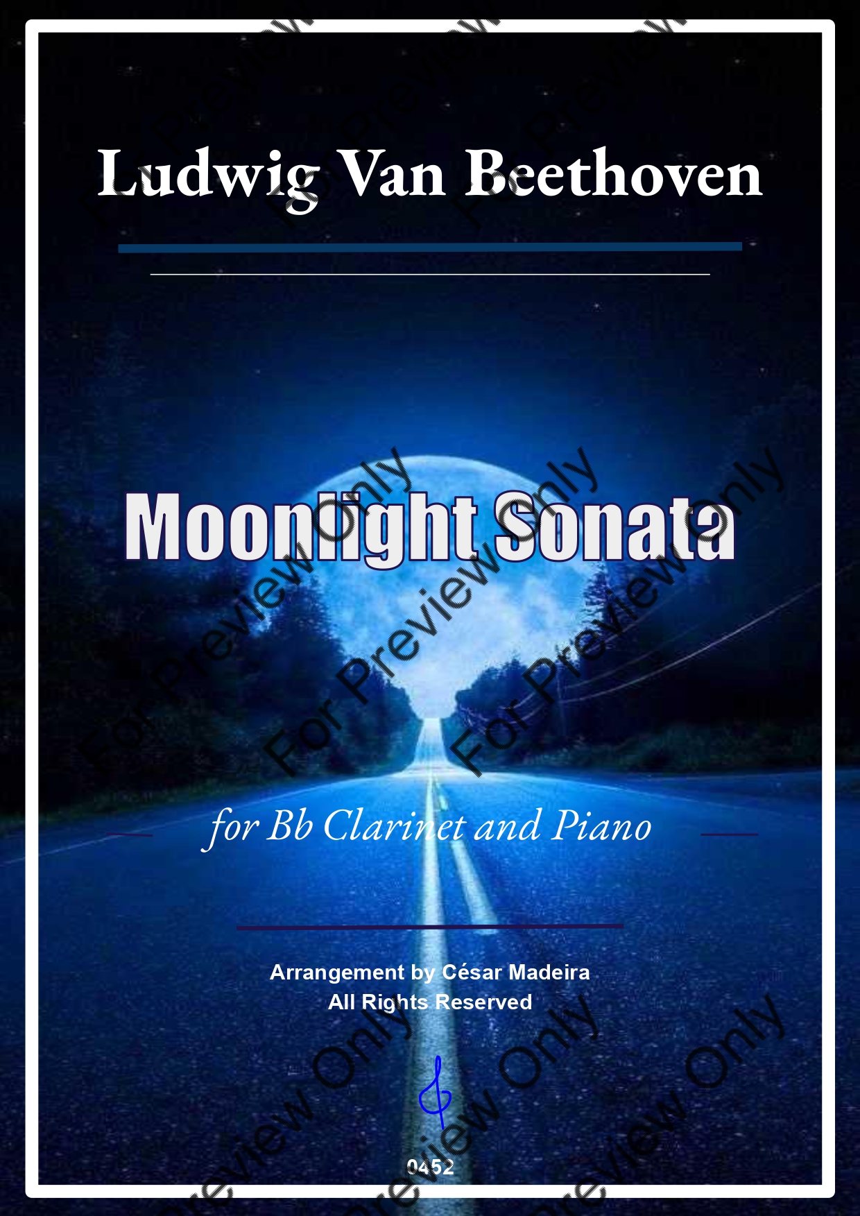 Moonlight Sonata (1 mov.) by Ludwig Van Beethoven. Arrangement for Bb Clarinet and Piano. With Full Score and Individual Parts. Have fun!