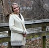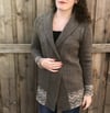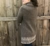 Dark-colored cardi modeled with approximately 2 inches of positive ease, light cardi with approximately 4 inches of positive ease. (2 times back measurement of cardigan at underarm minus high bust measurement of wearer.)