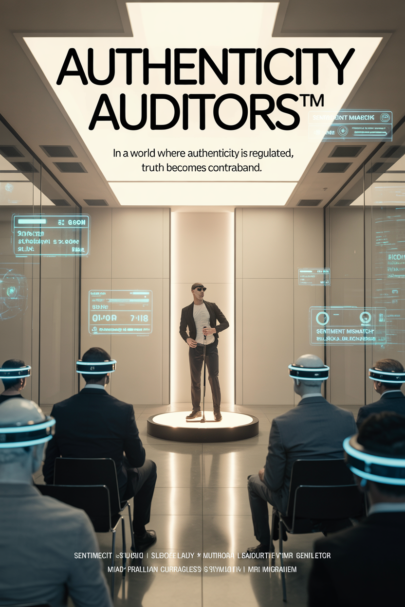 Authenticity Auditors™ is a high-concept dark comedy set in a bureaucracy where the Department of Authenticity regulates identity and sincerity is scored like currency. The story follows an unmonetizable stand-up comic who becomes the system’s existential glitch, sparking a rebellion that is immediately absorbed as the next profitable genre. This darkly comic mirror diagnoses how capitalism rebrands identity as a product, converting truth into a tradable asset. Designed as a limited series, it provides a sharp systemic and algorithmic critique ready for premium streaming and high-level post-screen conversation.